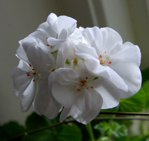 Mormor samlade på pelargoner, och hon pysslade med dem som sina barn. Hon tiggde till sig sticklingar om hon någon gång var bortbjuden och detta hem råkade hysa en pelargonvariant som mormor inte ägde. När hon så gick bort, 1988, och huset skulle tömmas, tog jag vara på hennes pelargoner. Jag har kvar dem alla – eller barnbarnsbarnbarnsbarn till dem – alla utom en laxfärgad sort, som tyvärr dog ut hos mig. De flesta jag har är en starkrosa sort – vars namn gått förlorat – och vit Mårbacka.