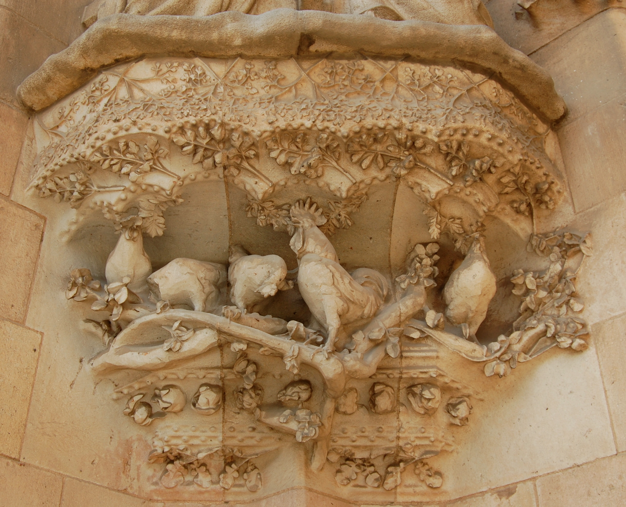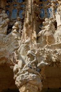 Så är vi ute igen – på andra sidan. Födelsefasaden, den magnifika, färdigställd av Gaudí själv. Den är så detaljrik och berättande, att man måste ha guideboken till hjälp för att förstå. Kristen symbolik och naturens skönhet i harmoni. Vi skapar alla vår egen förståelse.