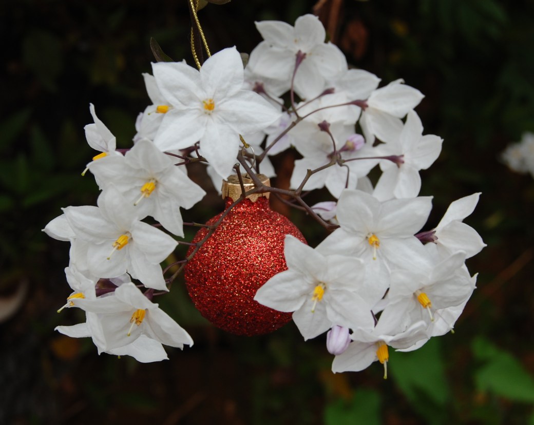 Jag blir stående och spanar en stund extra. Framåt gatan tittar några juldekorationer fram ur en blommande buske.