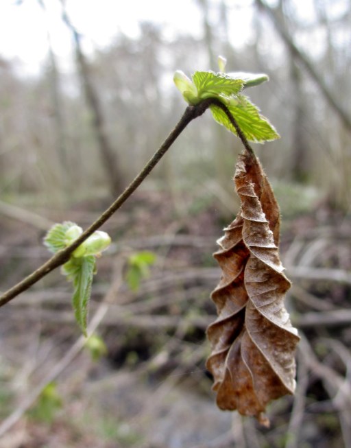 Hon visar mig hur det gamla lämnar plats åt det nya, hur hasselns knubbiga skott har en egen vagga, ett brandsegel för trygghet innan det stora steget.