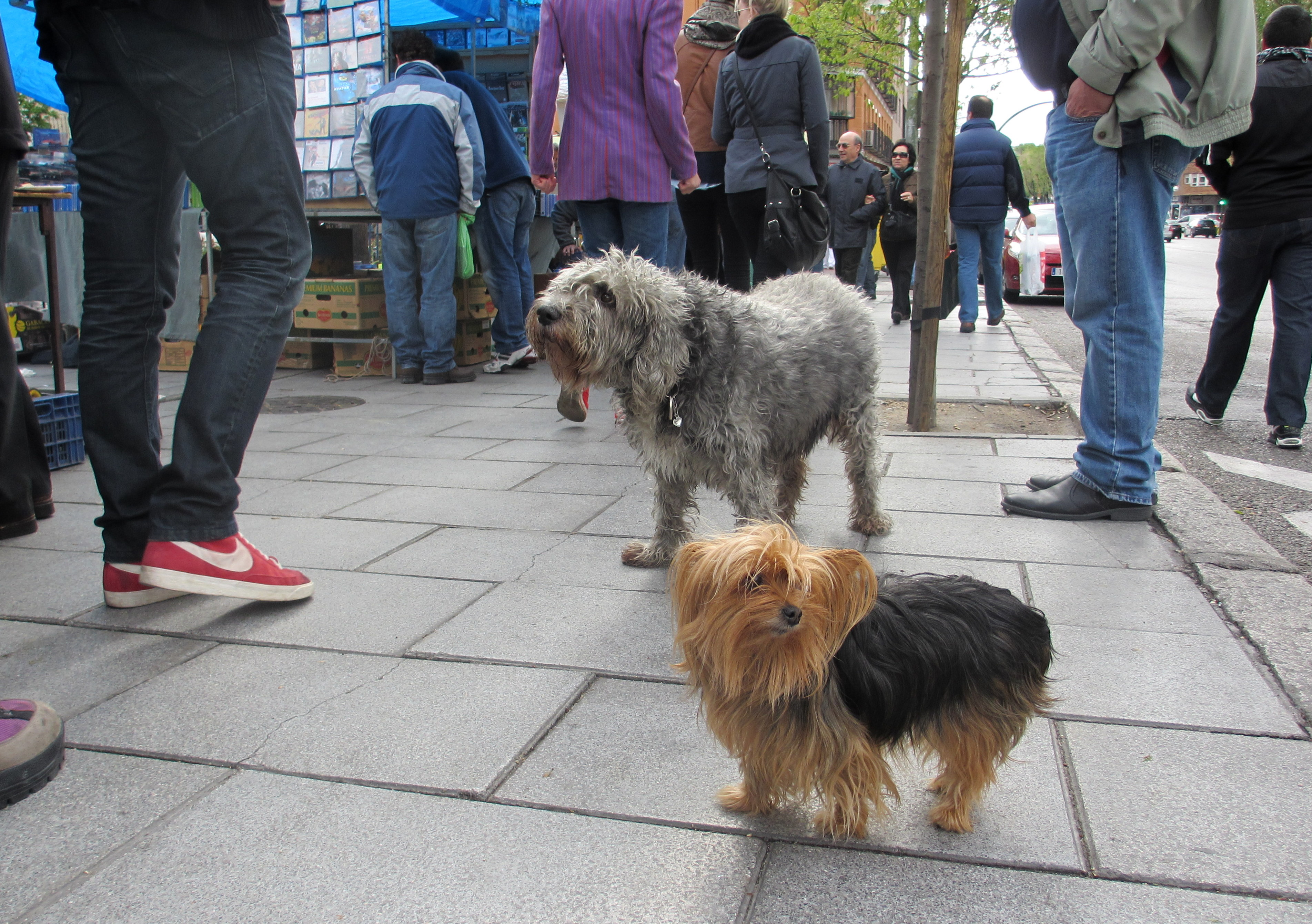 Tillbaka i Madrid på riktigt stor marknad, råkade jag på de här två vännerna. Helt klart var de kompisar och tillhörde någon av marknadsståndsägarna. Men, blickstilla stod de mitt bland folk, cyklar, motorcyklar, bilar, barnvagnar och barn, tutor, visslor, musik, skratt och skrik. Jag pratade en stund med dem och extra mycket med den större hunden, som nog var lite äldre och lite för tung för att det skulle vara hälsosamt för honom. Vi kom bra överens och han höll faktiskt med mig. Men, frestelserna i en stor stad är många…