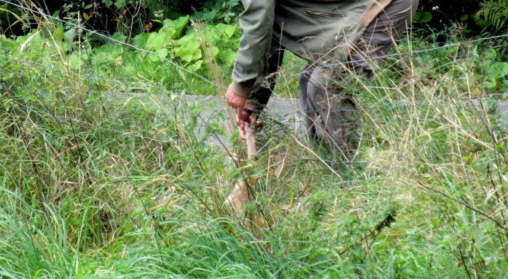 Nästan nere vid vägen är min man redan framme vid kidet, som har fastnat olyckligt i fårstaketet. En ögla har dragits åt och han ligger på rygg med benet rakt upp i snaran. Nu säger förmodligen instinkten honom att ligga fullkomligt stilla istället för att krångla. Allt ser fint ut, inga skärsår eller annat. Försiktigt ut ur öglan…