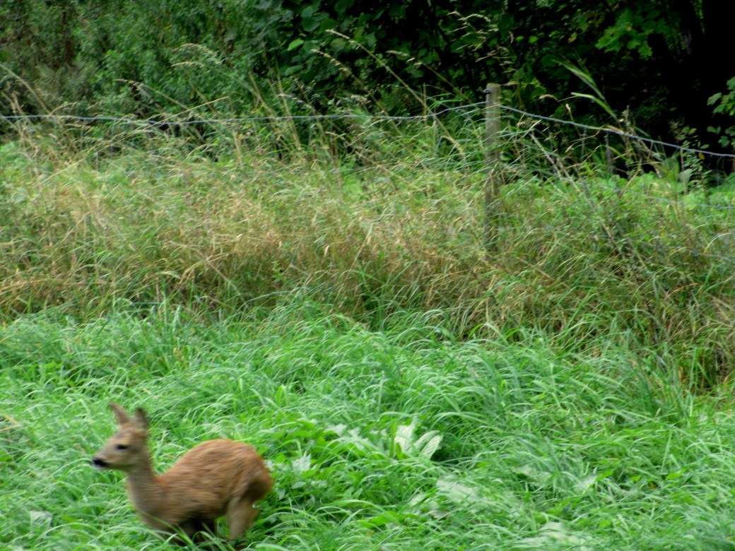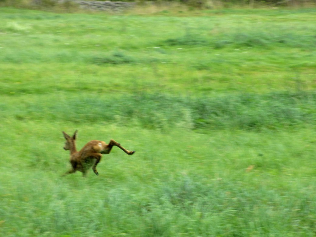Efter en lång, härlig tur närmade vi oss utgångspunkten för vandringen igen. Då hör vi långa, utdragna skrik som låter som från en fågel, snarast en trana, men inte borde de vara här nu? Vi ökar på stegen. Mot slutet på stigen ligger en äng till vänster om oss, och där får vi se ett rådjur med kid, som oroligt rör sig mot staketet på andra sidan. Det klagande skriket tilltar och min hals snörps åt av en stigande rädsla för att ett av hennes kid har blivit påkört och ligger på grusvägen bakom fårstängslet.