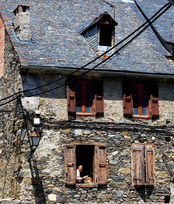 Man, reading and talking to his canary bird. Viela, The Pyrenees, Spain.