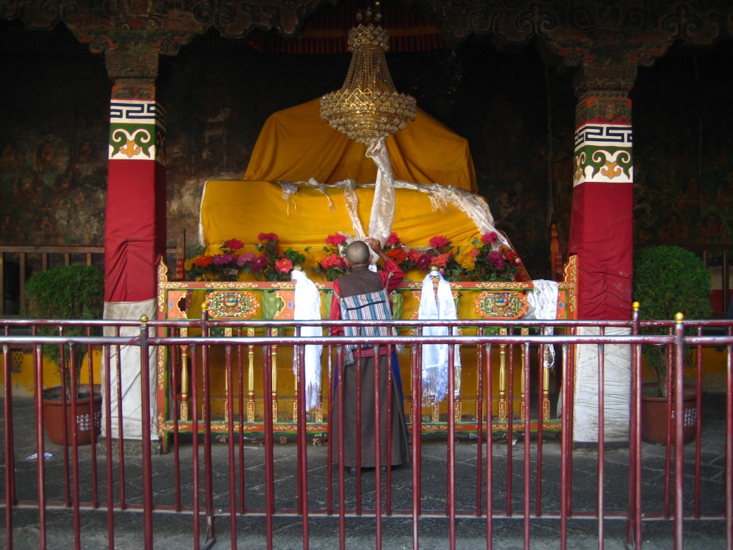 Old monk leaving a sacrificial white silk shawl on the Dalai Lama throne, Tibet.