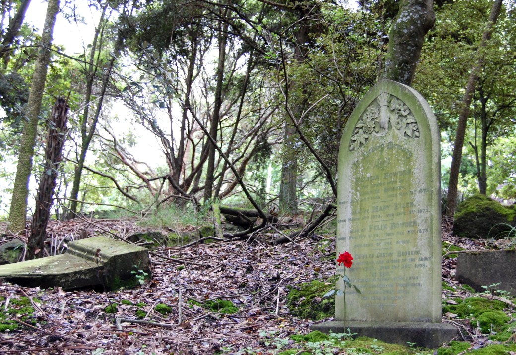 Forgotten and deserted graveyard, Auckland, New Zeeland. Most stones were broken or lying down in the dusk. Many a name was followed by a story from the violent 19th century. Strange finding a single red rose.