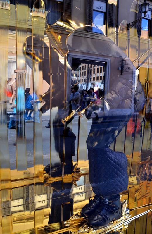 Difficult, I know. I think – it is some ski overalls with a big helmet…he’s standing on skis and I could not get a good photo because the window was so reflective – but I kept it because it looked so strange…