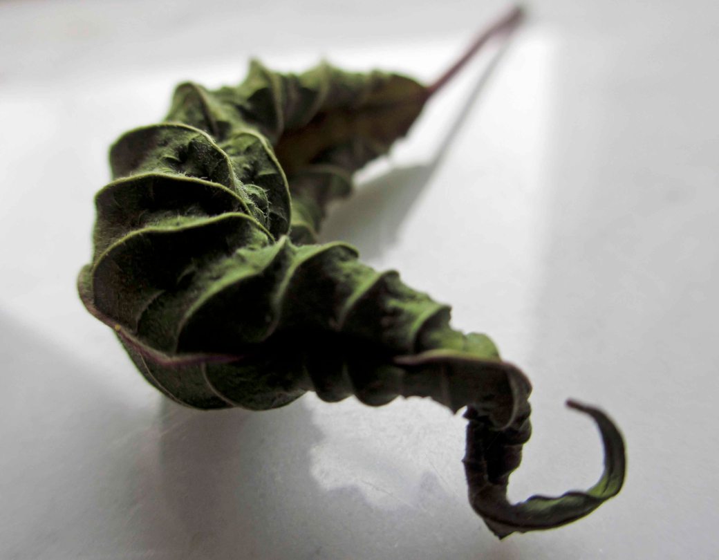 Today my poinsettias had to go. Left in the window-frame – a beautifully twisted leaf.