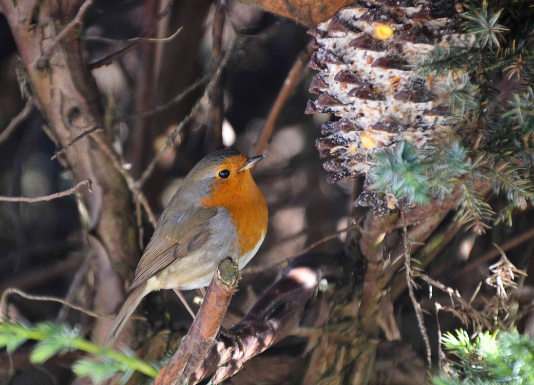 My favourite bird is the Robin. His friendly company is there summer as winter. His song is soft and flute-like, and his clicking sound of warning meets anyone who appears too suddenly or too close. Here he is watching me through the window with his big round eyes.