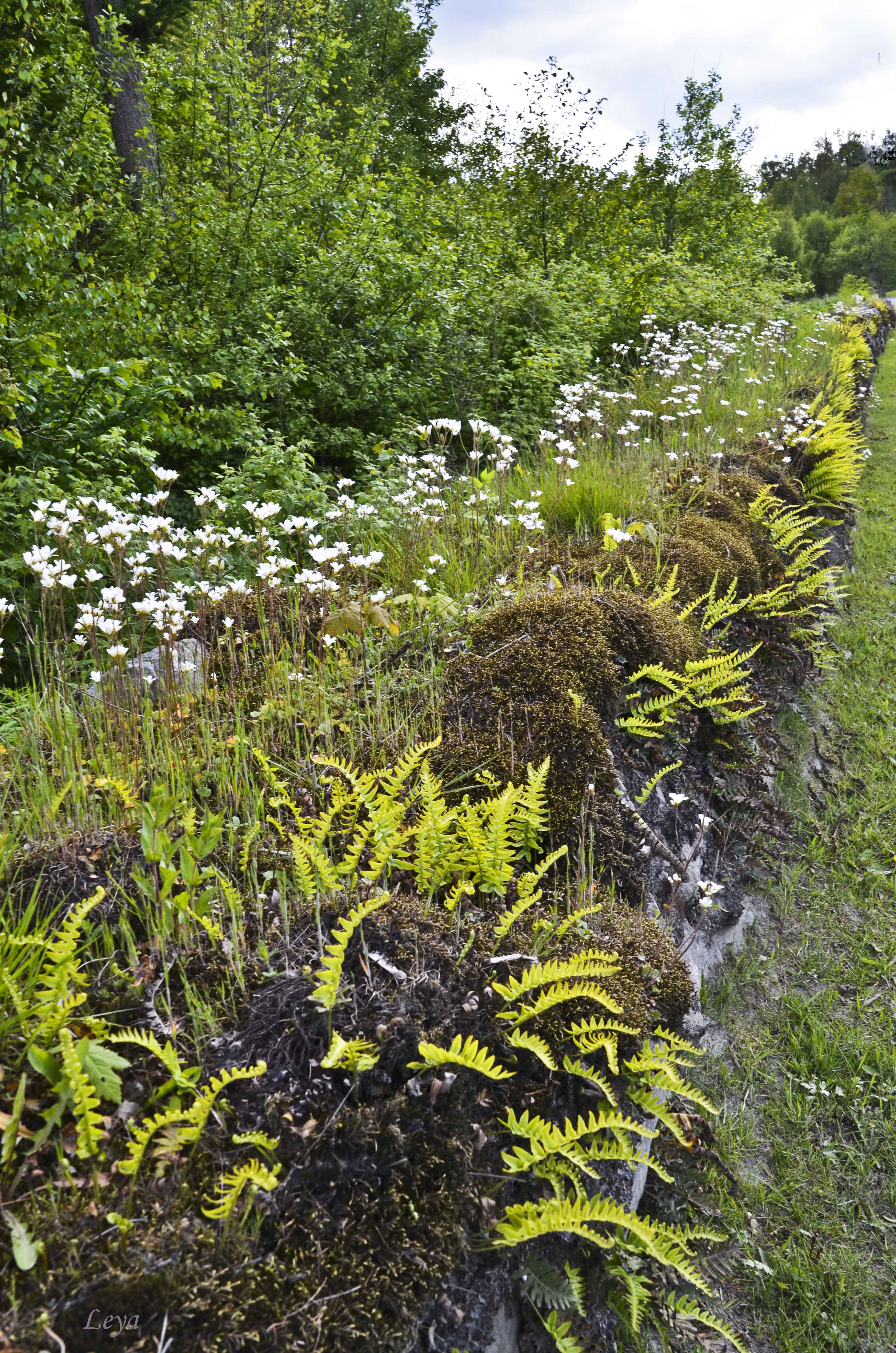 Home in Sweden again, and on my way to an ordinary dog walk, Looking out the window I realize that on the way there is a stone wall clad in bright green ferns and snow white meadow saxifrage. I just had to stop for a photo…