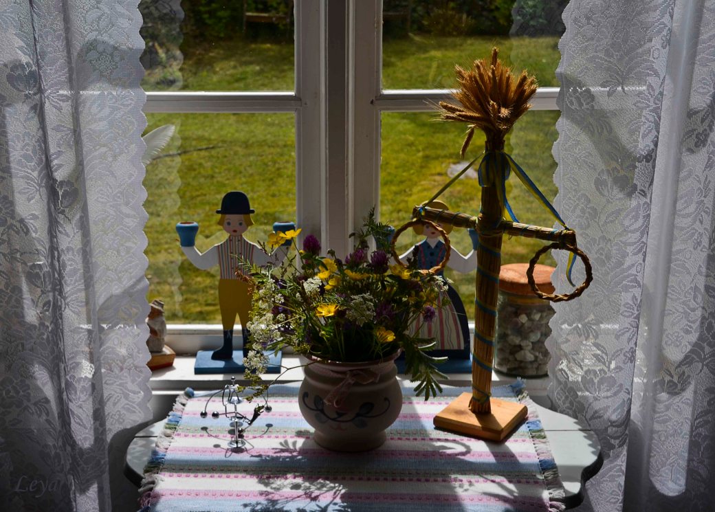 Spetsgardiner, folkdräkter, bukett med sommarblommor, midsommarstång och vita spröjsade fönster en direkt sommaridyll! Snyggt!