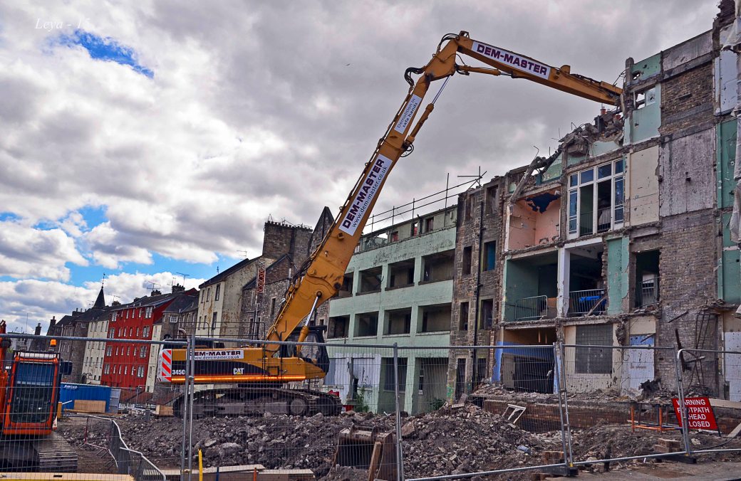 Demolition! There must have been loads of crashing noises. And the sky has brought out grey clouds to set the mood. How apt. Great capture, love the vividness of the colours 🙂