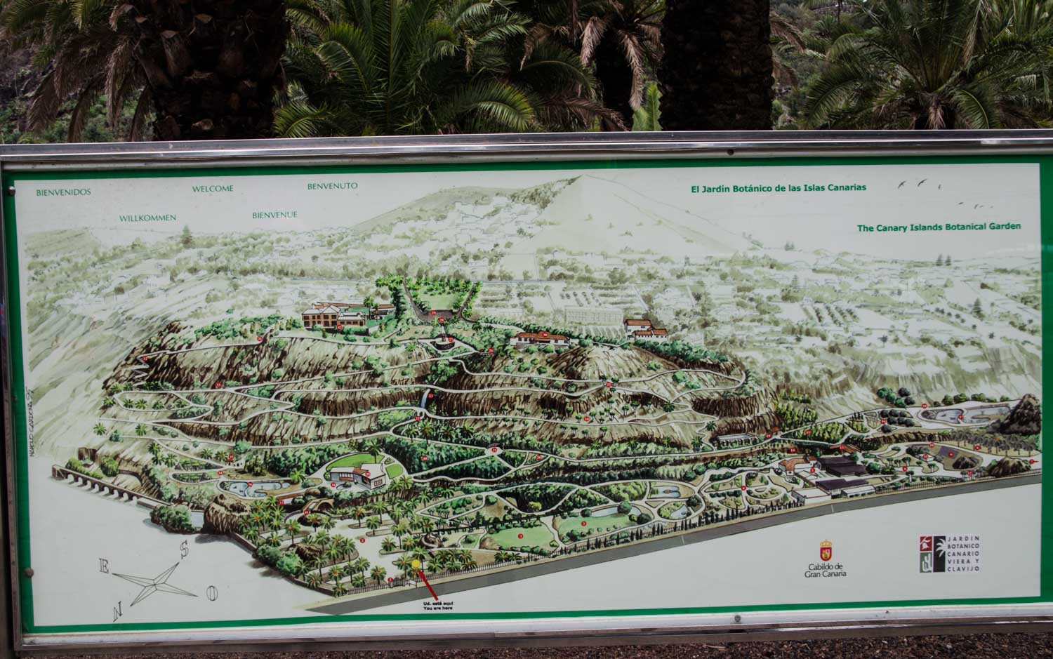 According to Wikipedia, the garden comprises approximately 27 acres (10 hectares), on which approximately 500 plant species endemic to the Canary Islands are cultivated. Important divisions are the ”Garden of the Islands” (Jardín de las Islas), the ”Garden of Cacti and Succulents” (Jardín de Cactus y Suculentas), where approximately 10,000 cultivars of succulents are on display, the ”Macaronesian Ornamental Garden” (Jardín Macaronésico Ornamental), and the “Hidden Garden” (El Jardín Escondido) with greenhouse. Also worthy of mention are the pinetum (El Pínar) and the ”Laurel-leaved Forests” (Bosque de Laurísílva), featuring trees which once covered most of Macaronesia prior to Spanish settlement. At the ”Fountain of the Wisemen” (La Fuente de Los Sabios), botanists who discovered and described the flora of the Canary Islands are honored.