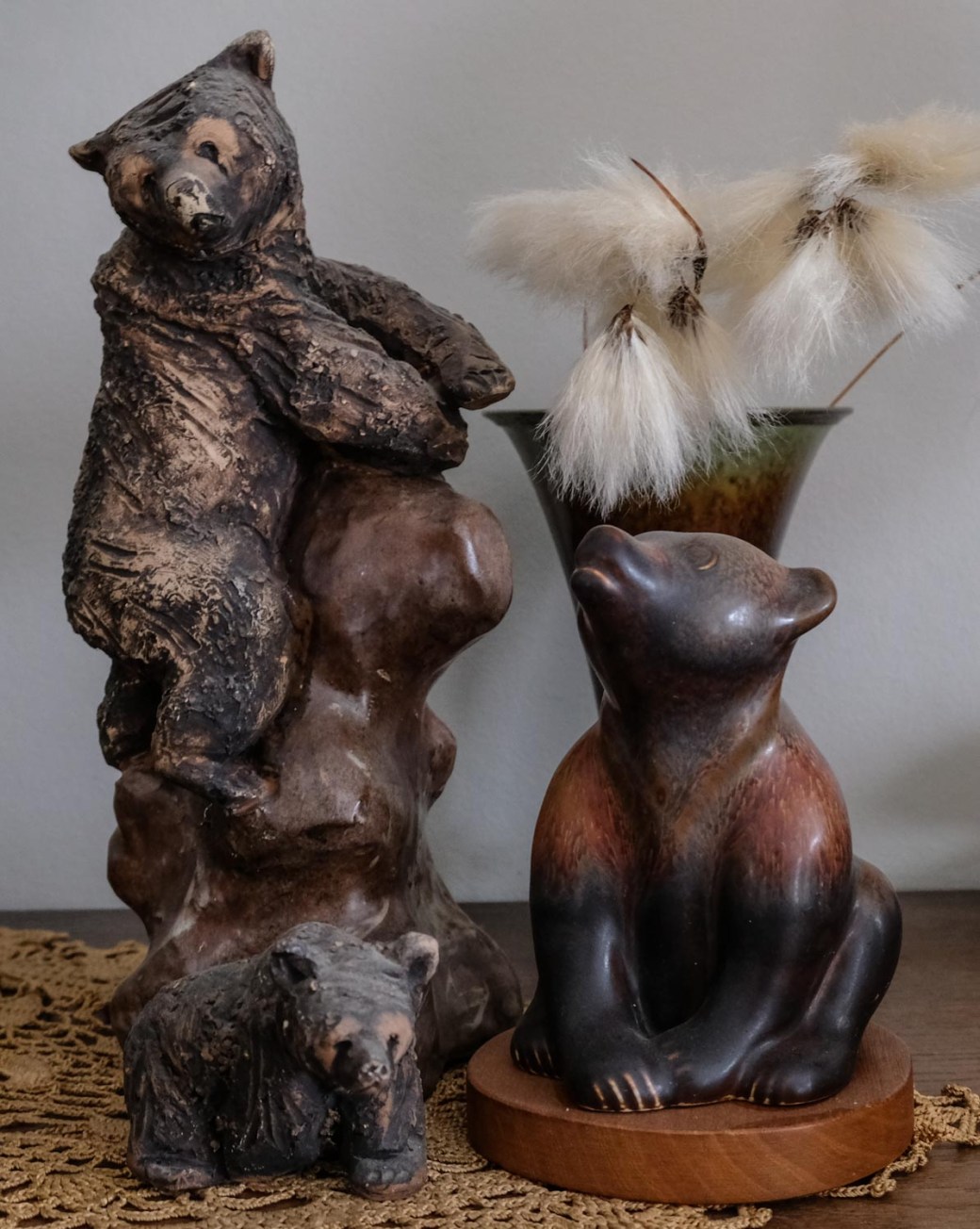 The three old bears were inherited from my mother-in-law. Somehow I love their expressions and I remember exactly where they were placed in her home. Now I let them sit together, contemplating life, on the golden crocheted tablecloths made by my husband’s grandmother, Anna.