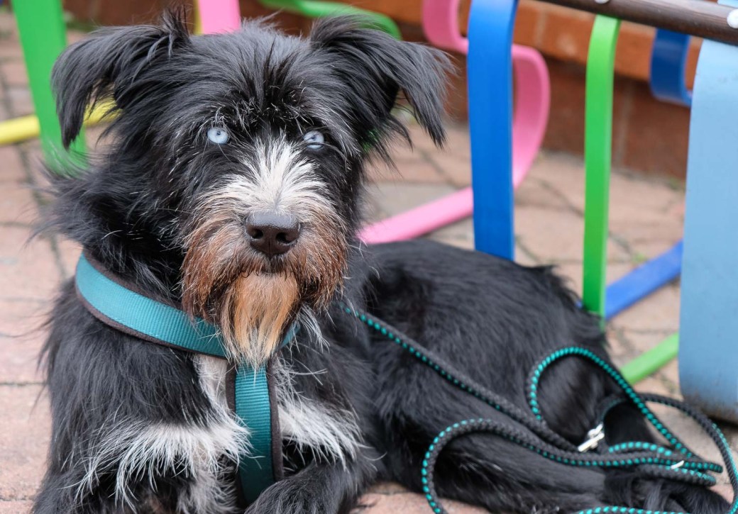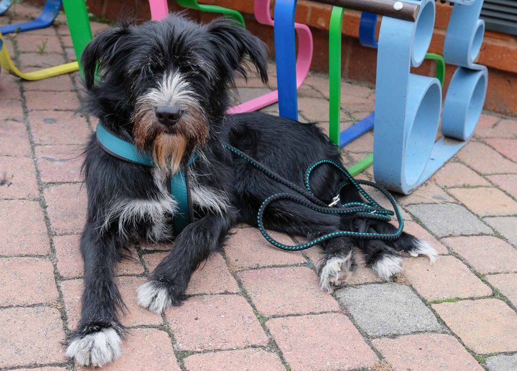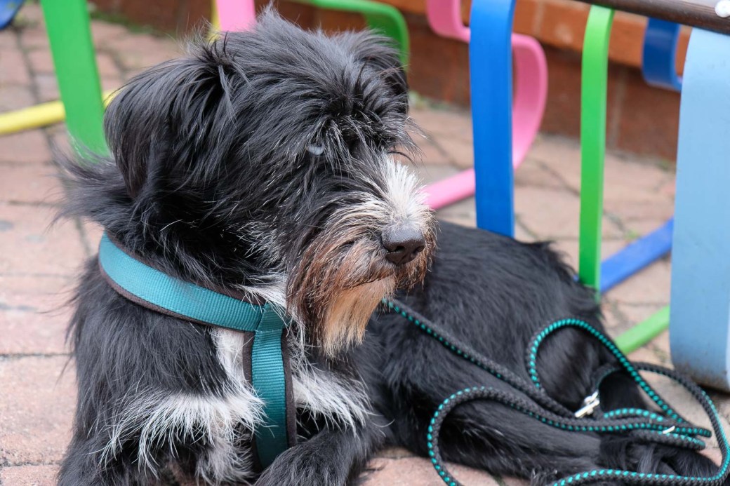 I met many lovely people, and talked to some…when I suddenly came across a couple sitting on a colourful bench. At their feet, a gorgeous dog with fantastic fur – both colours and structure. About the size of a Labrador, but with a slender and agile appearance.