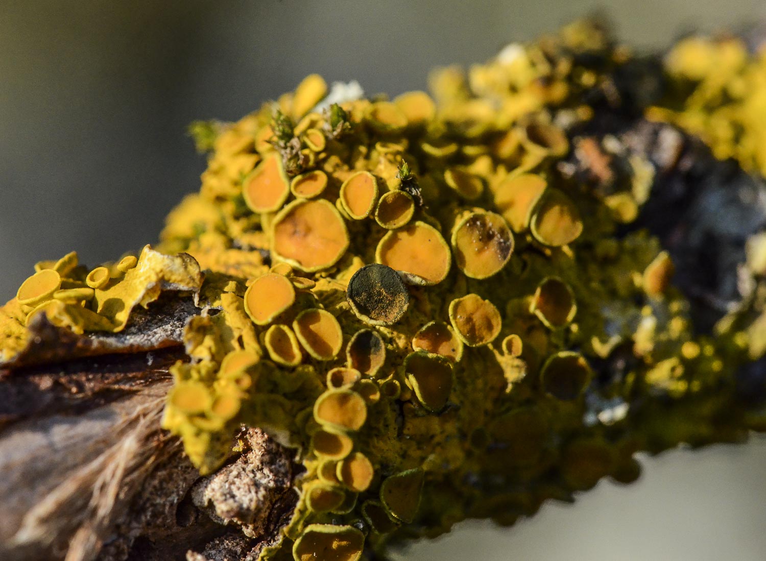 Less spectacular, but very saffron – is the millimeter lichen on my old apple tree.