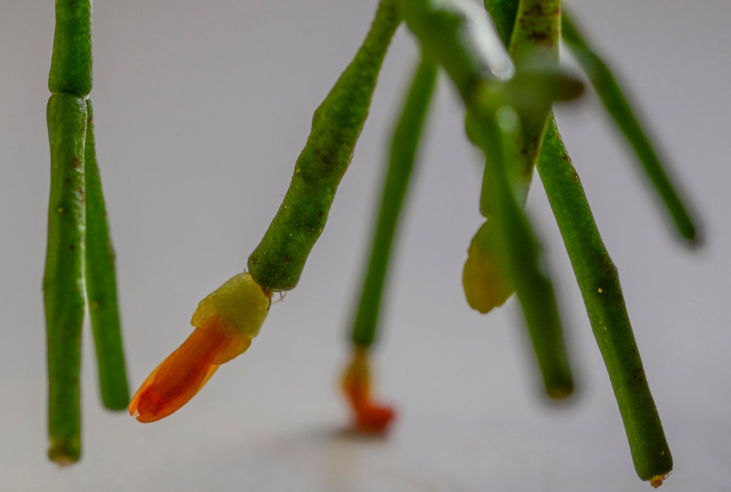 The sun is shining in, and the colours are returning to my home. In the header a Tradescantia, or Wandering Jew, and here a Hatiora Salicornioides (Both from Brazil). The English name is said to be bottle plant, drunkard’s dream!