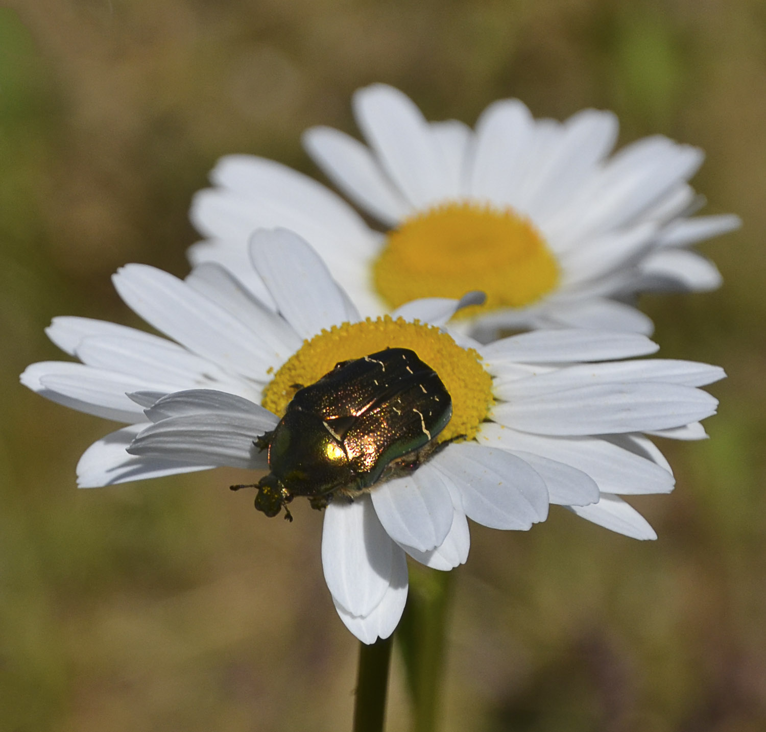 1. Beautiful. We call that insect a ”peach scarab”. We get them later in the summer. They love to eat peaches and other friut.