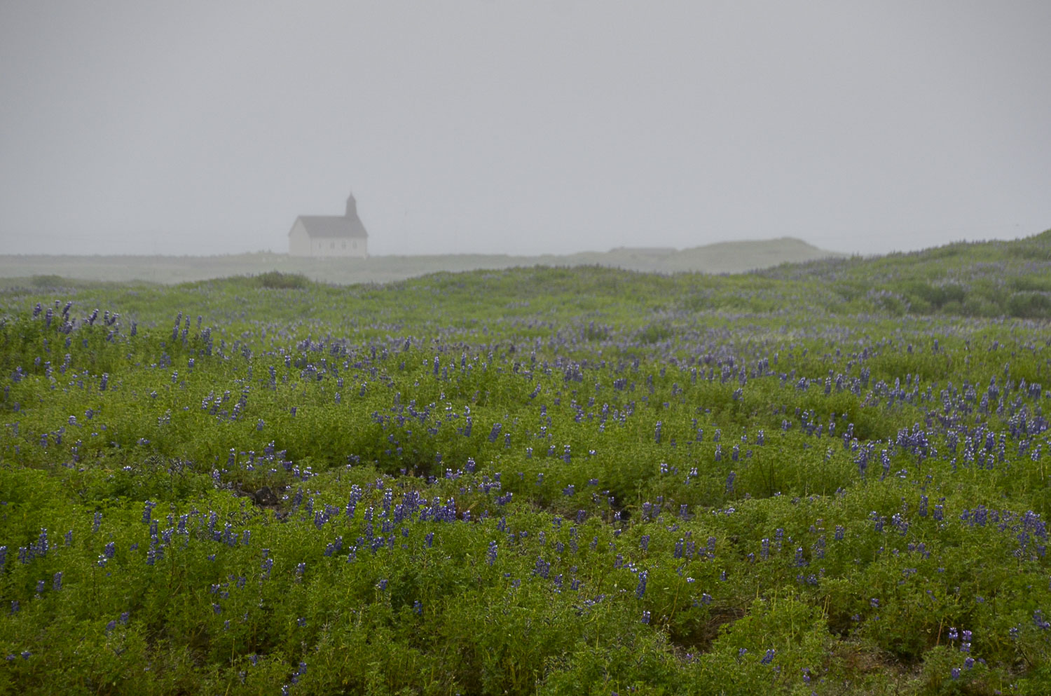Wherever you go on Iceland, you will find lonely churches perched on mountain tops, hidden behind towering lava flows – or in fields of lupins. Looking like tiny toys placed there by a playful congregation. Often the little church is clearly visible from afar – but this one was only faintly visible in the fog. (And the lupins are of Alaskan origin…)