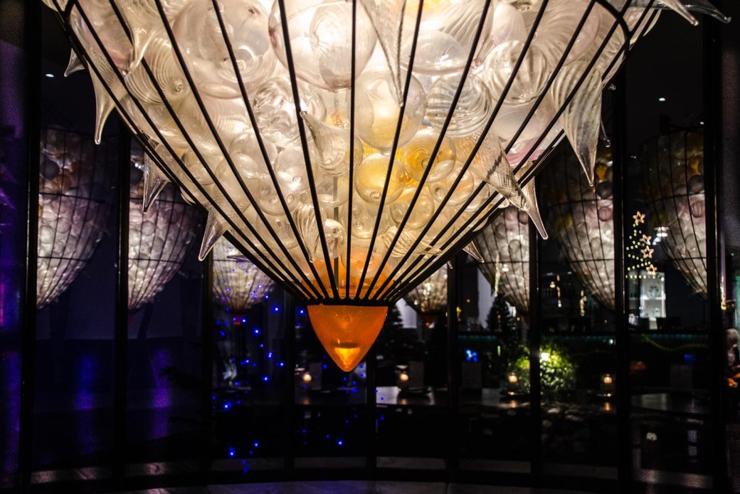 A spectacular lamp fills the room at Kosta Boda Spa Hotel – its lines are also reflected in the windows.