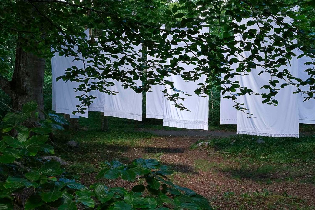 A forest exhibition at Wanås – old, embroidered linen in the silent trees.