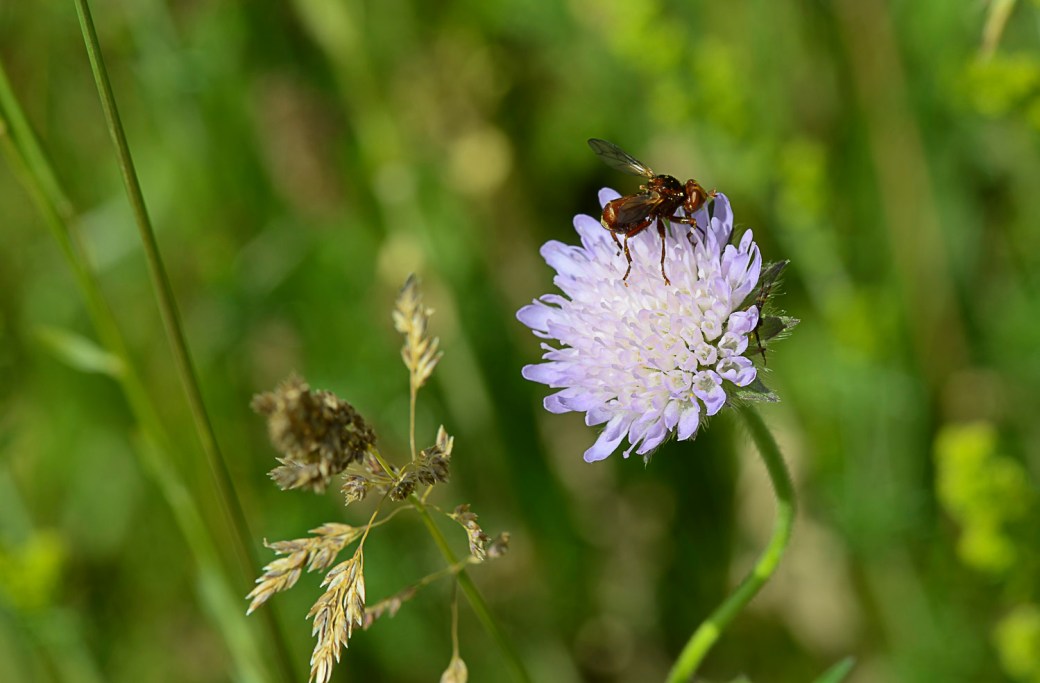 Pretty pincushion flower. I wonder if the bug is a flying ant?