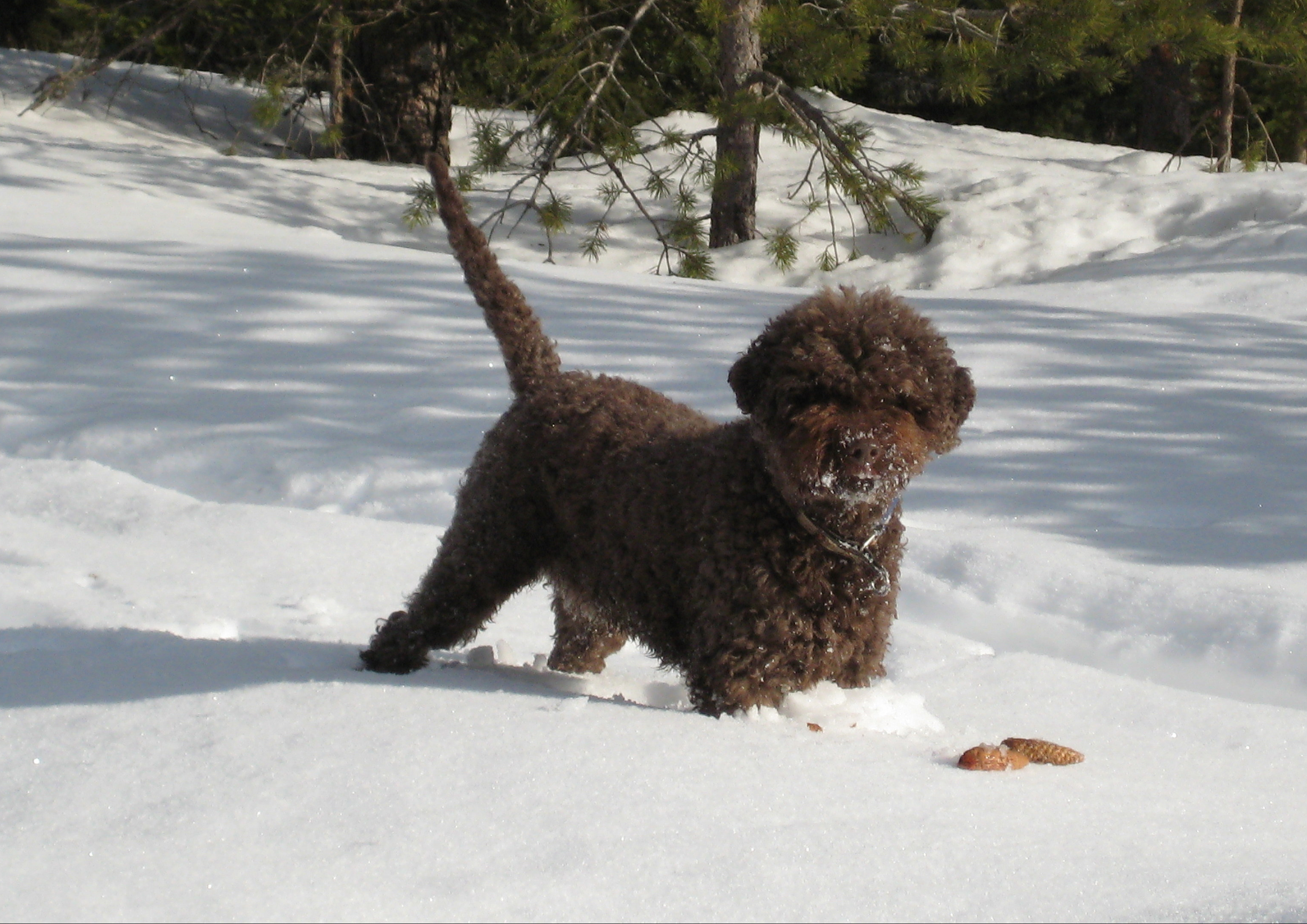 Mille, our first Lagotto (Milo look-a-like, isn’t he?) was a cone collector…he could easily run with 5 (five) cones in his mouth without dropping a single one. He loved going to Fryksås every year – knowing he could play around every day in that cold snow.