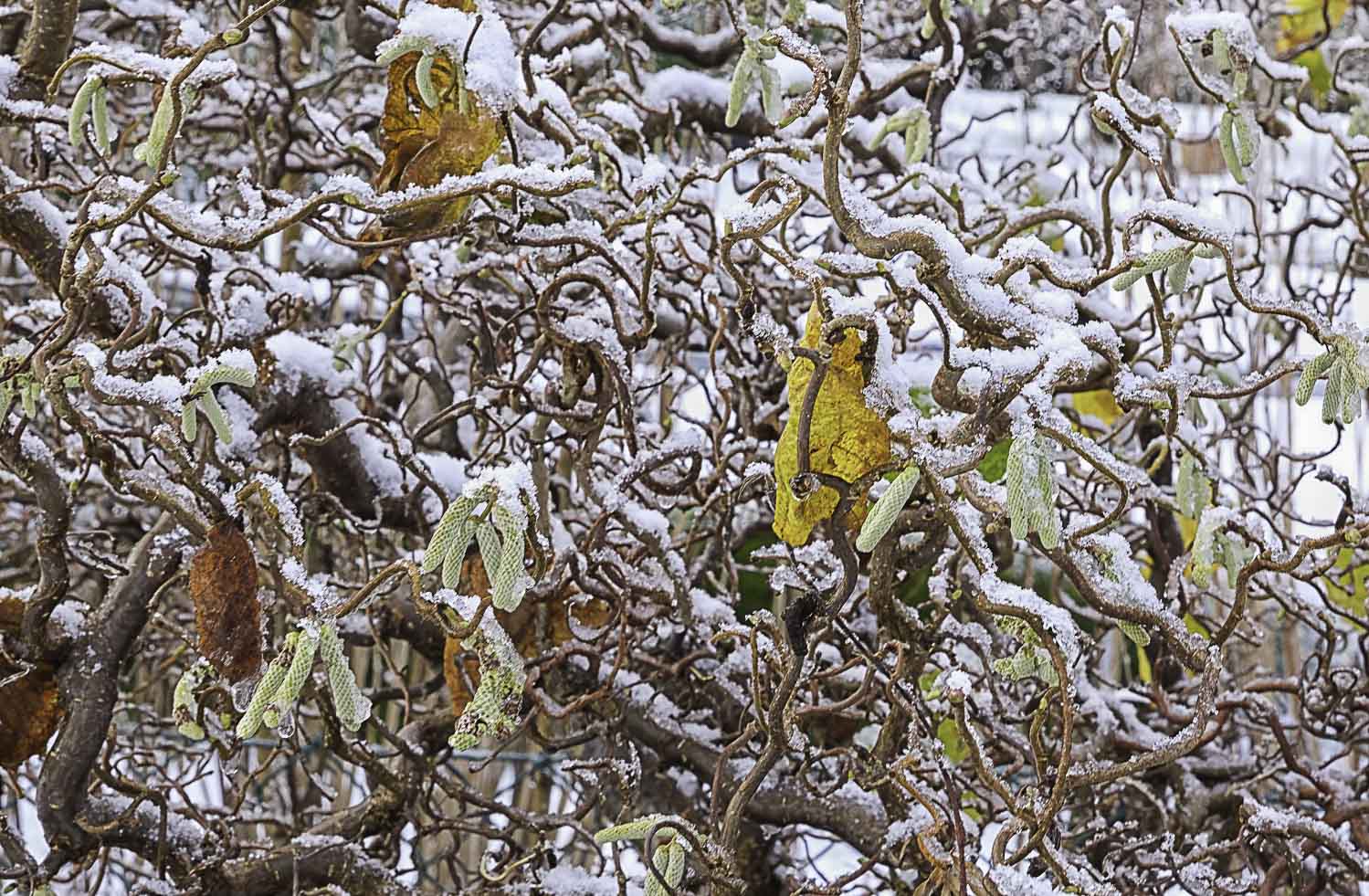 1. Such a great natural pattern. My twisted / contorted Hazel is still hanging onto its leaves, but the catkins are very tiny. And no frost or snow to beautify it so.