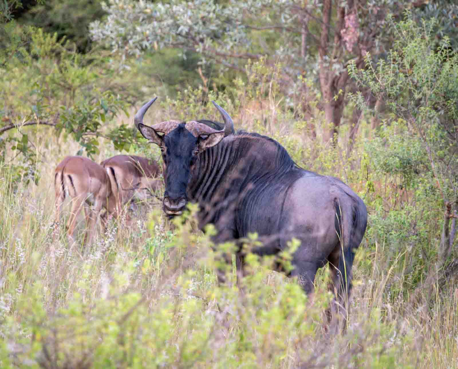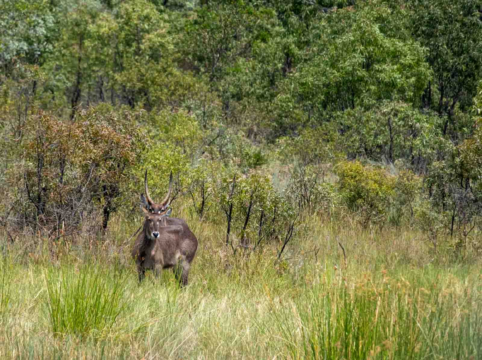 Another beauty is the large waterbuck with its long, spiral horns curving first backwards, then forwards. The horns are 55-99cm. This couple was watching us from afar.
