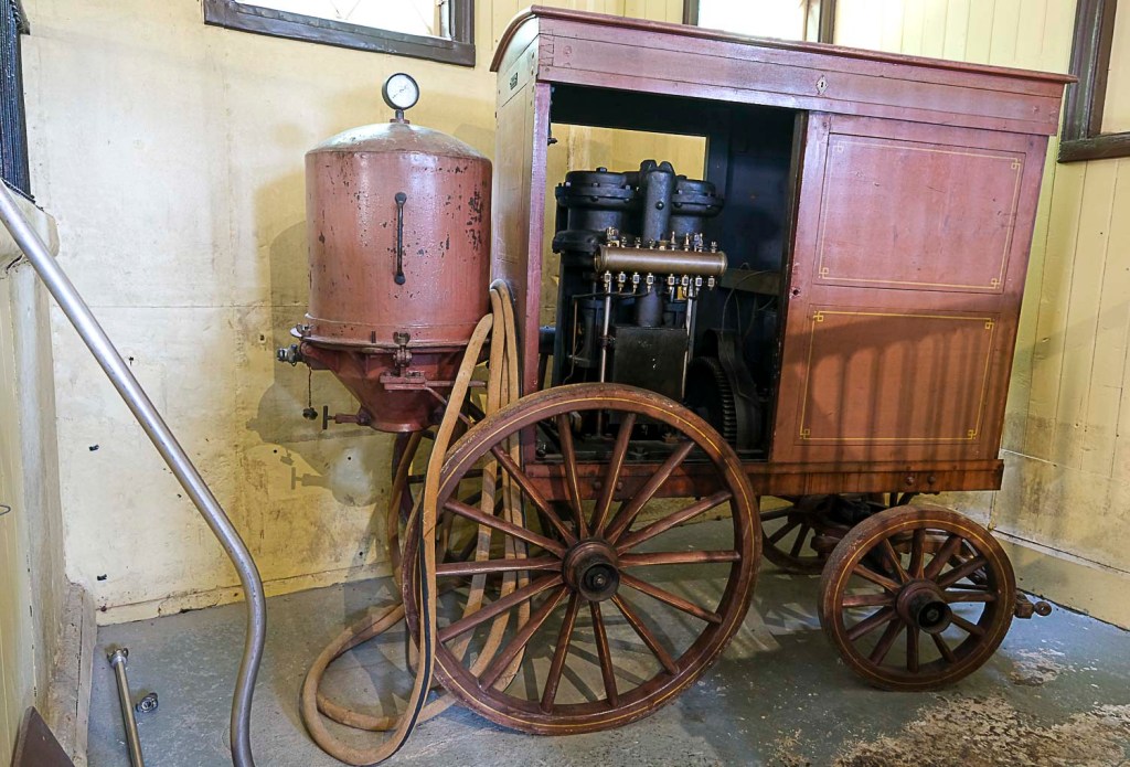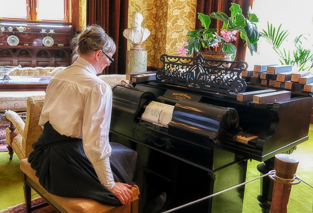 The player piano or pianola to the left, is one of the last existing, working pianolas. The many boxes on top of it contains pieces of music for the instrument. The last picture shows the quite elegant vaccuum cleaner…