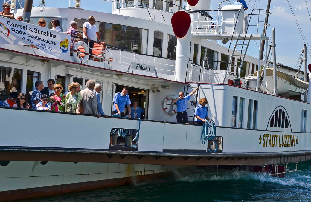 Kändisar som Eva Perón och Drottning Elisabeth har åkt med Stadt Luzern. Vi fick följa med henne via Weggis till Vitznau i fint sommarväder. Det var en stolt kapten på ett vackert fartyg. Här med några medpassagerare och vyer.