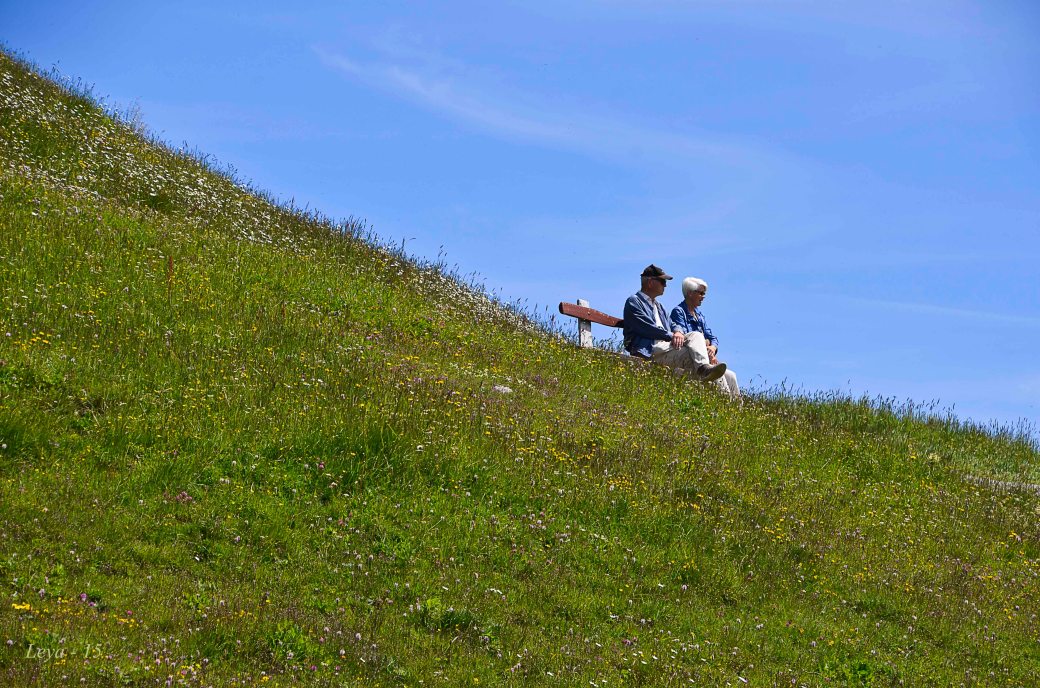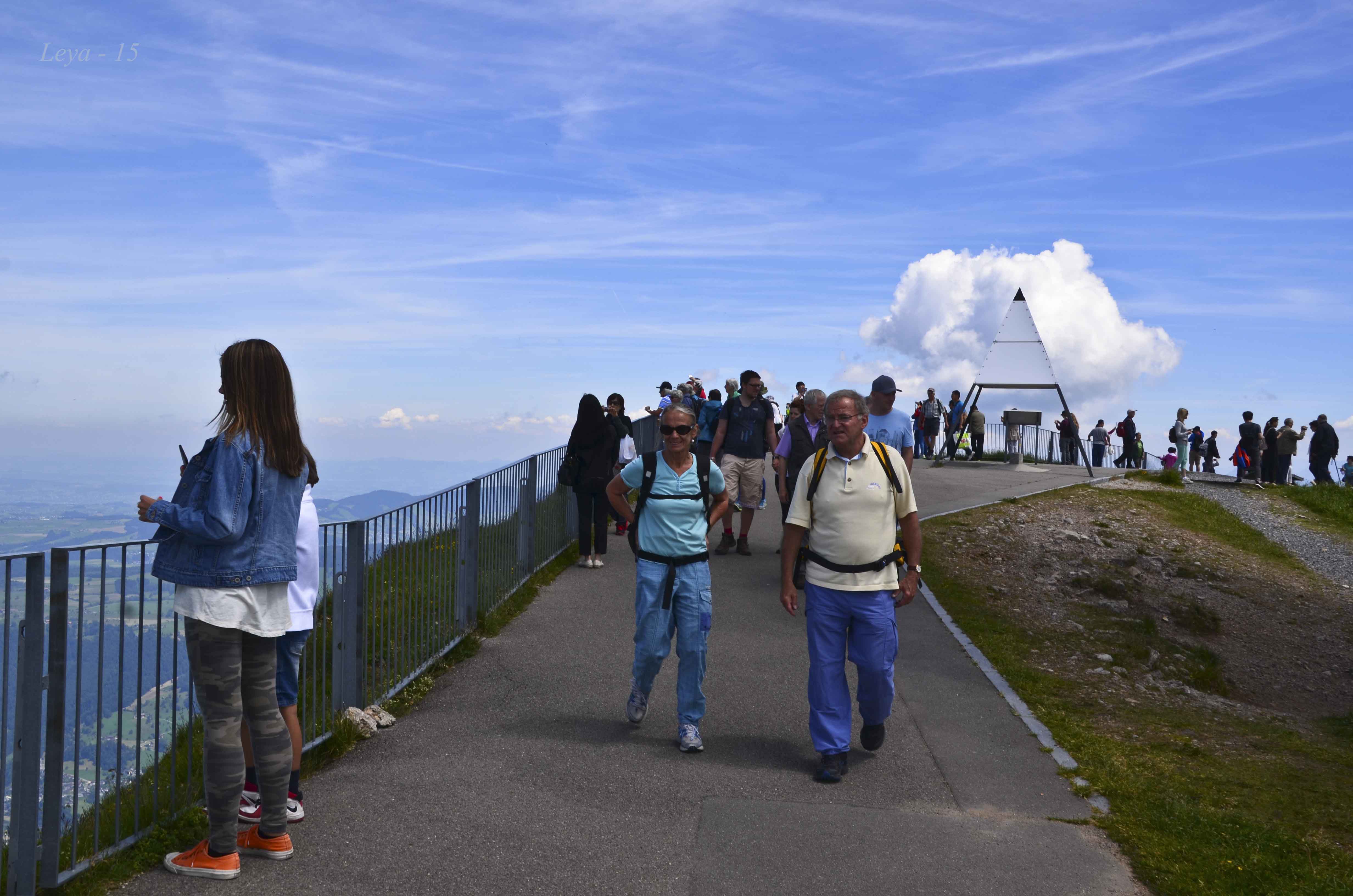 Det var närmast trängsel på toppstationen Rigi Kulm. Trots höjden var det både varmt och vindstilla, men mycket mer behagligt än nere i dalen och byarna.