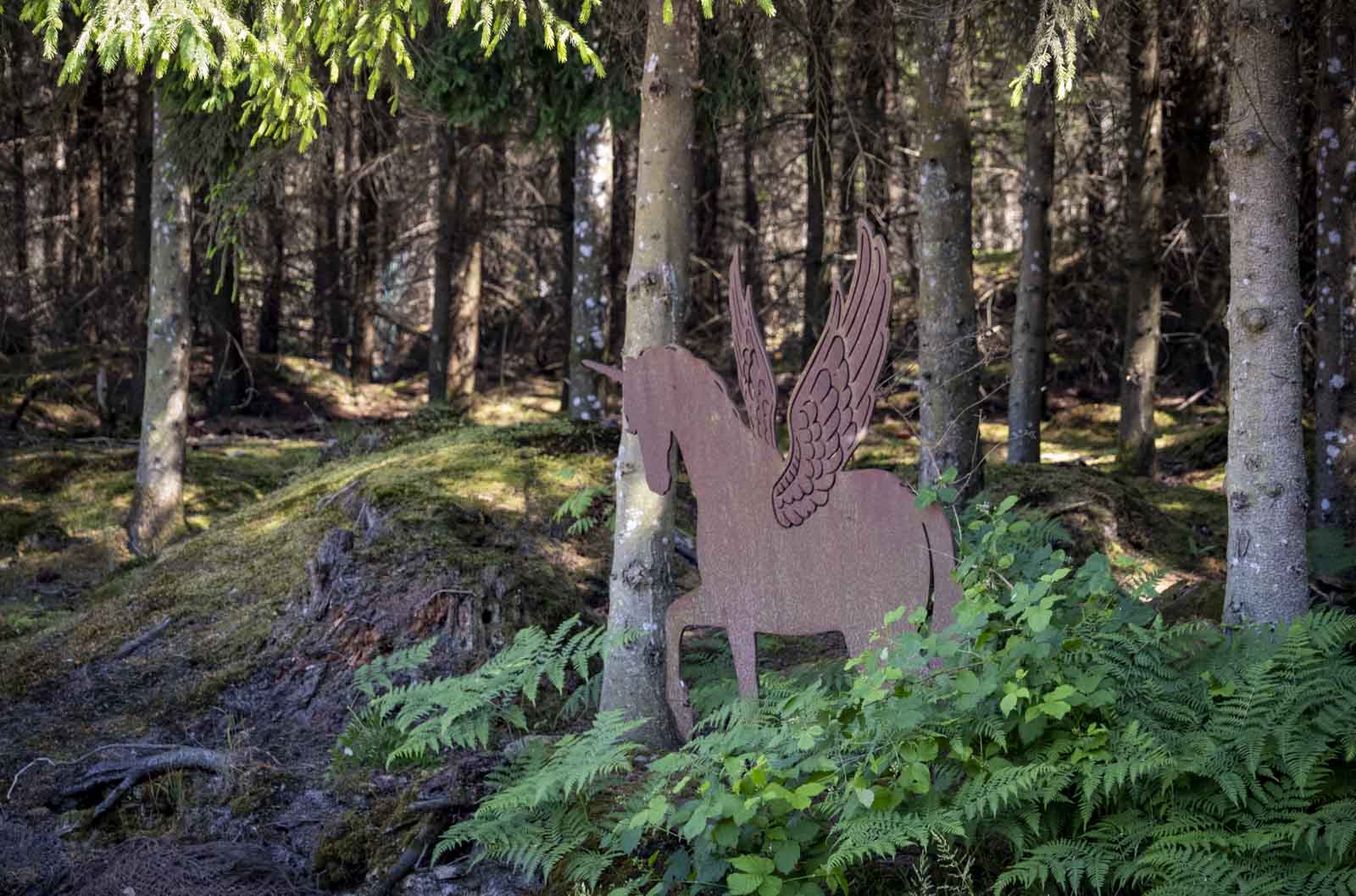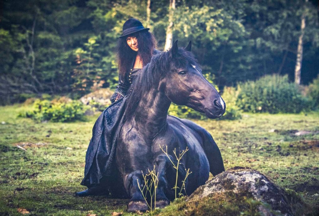 Last Sunday I met one of the most creative souls I have ever met – Susanne Demåne. We went with some friends to see her studio and garden – she calls it ”The World of Demåne.” In 1998 she bought this old schoolhouse – rather dilapidated and no garden worthy of the name. Over the years she has created a fantastic place filled with creativity and fantasy, which also involves animals like beautiful black horses of the breeds Frieser, Knabstrupper, Arab and Shetland pony. Horses she trains with nothing but her voice and the bond she makes with them.