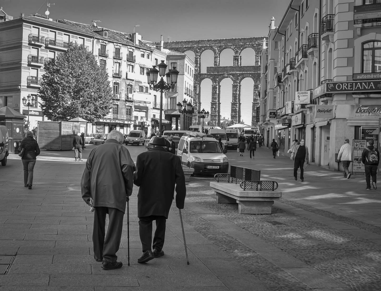 This is a 13 year old picture from Segovia, Spain. I was walking this city street, eagerly looking for the famous aqueduct… and suddenly it appeared in front of me, the impressive, Roman construction going right through Segovia. I was left standing in the middle of the street, gasping, filled with awe. How small the modern buildings seemed! After some 5-10 minutes, two men, old friends I guess, came slowly walking by. Three legged – but strong.