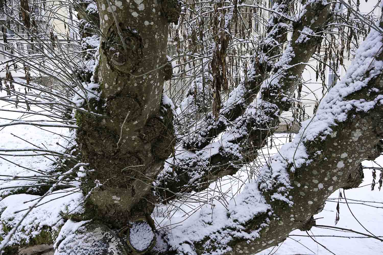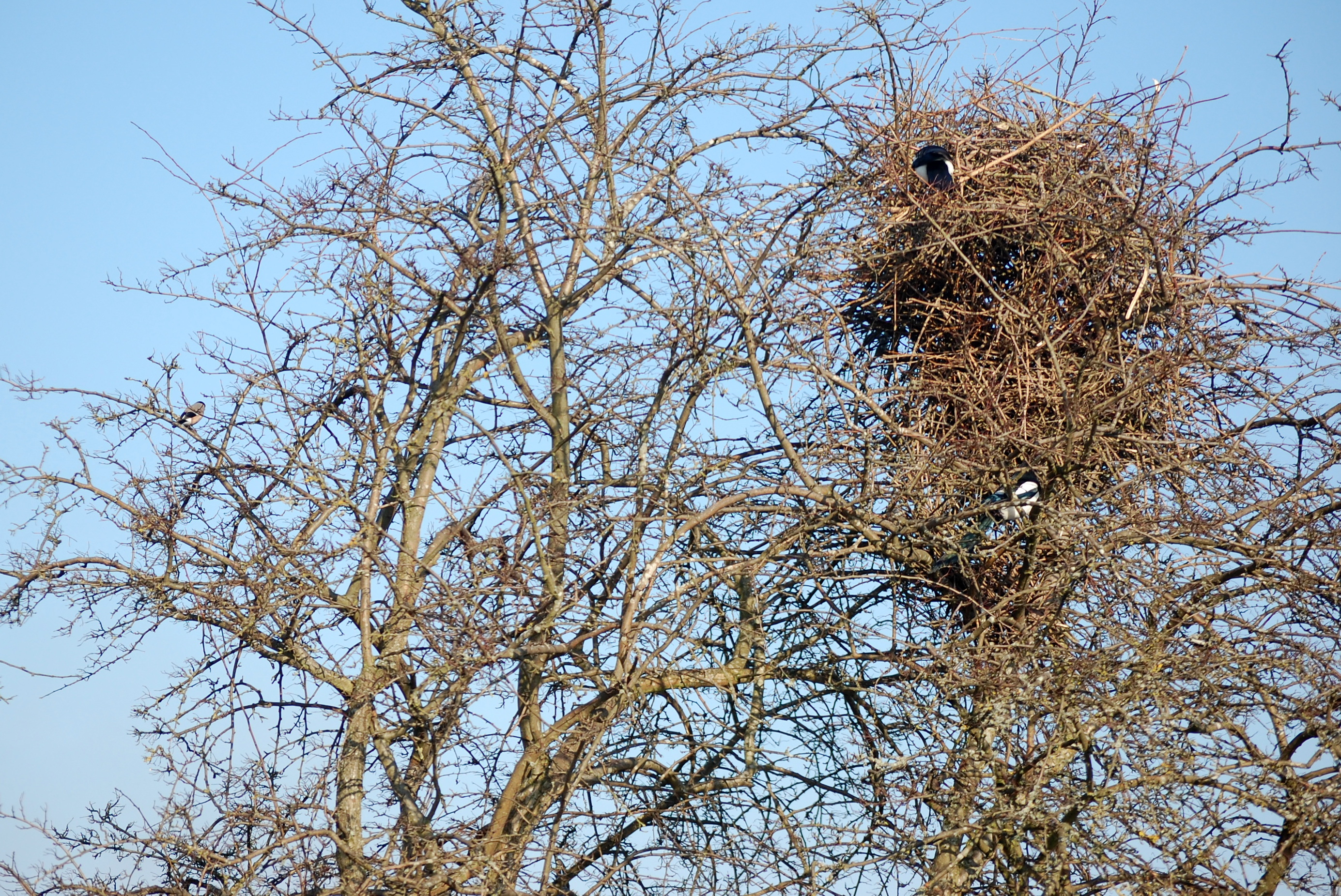 Magpies often build high as well, and their nests are very intricate. They are durable, domed structures made of sticks and twigs and contain an interior mud cup and lining. Every nest has got two entrances – one close to the top and one from the side or under – and it can reach more than 1 meter in height. Not the nest to the far right though, that is a small but sturdy bird’s nest found during a winter walk.