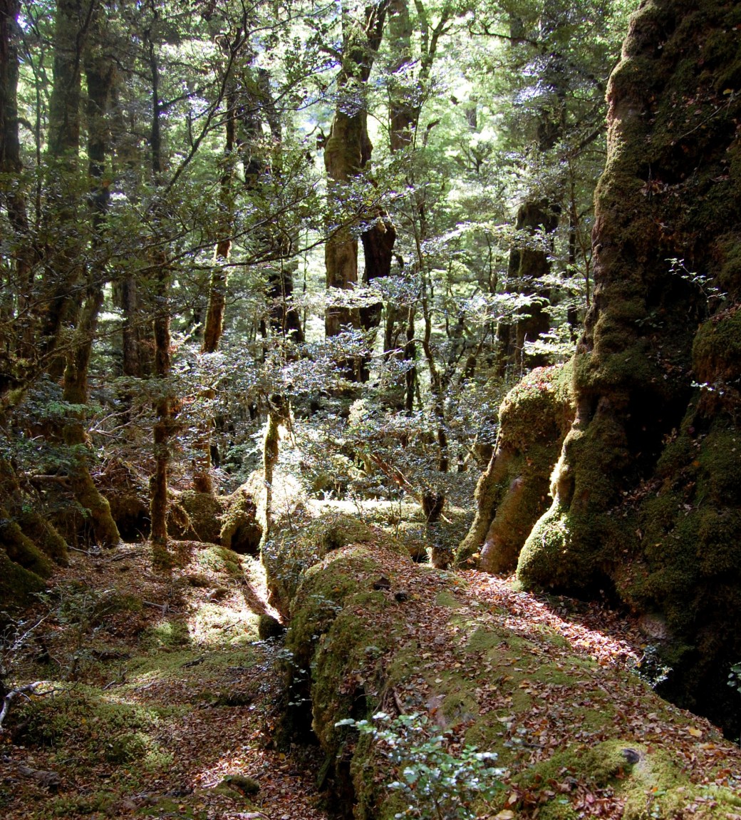 The Southern Beech is a very beautiful tree with rather tiny leaves, seen in enchanted forests by the road to Milford Sound. The fallen tree trunks still full of new branches.
