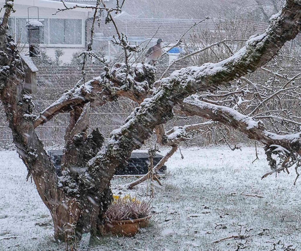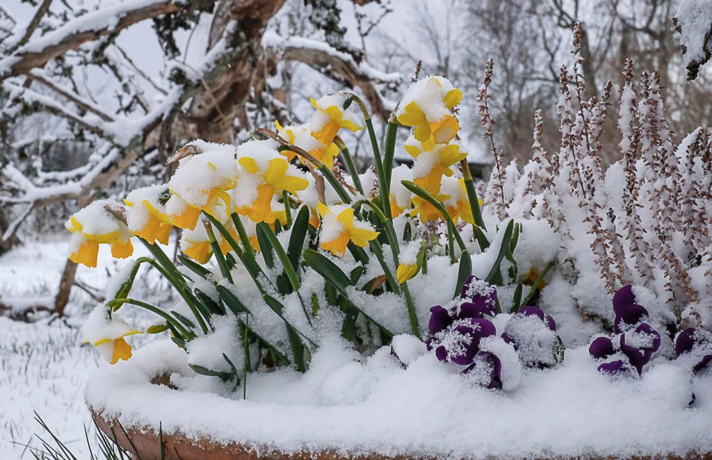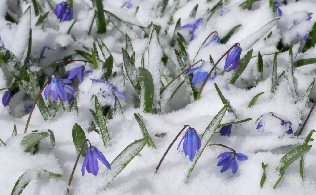 The doves got new snow caps –– but my spring flower pot looked a bit sulky…– and the poor scilla looked more blue than ever.