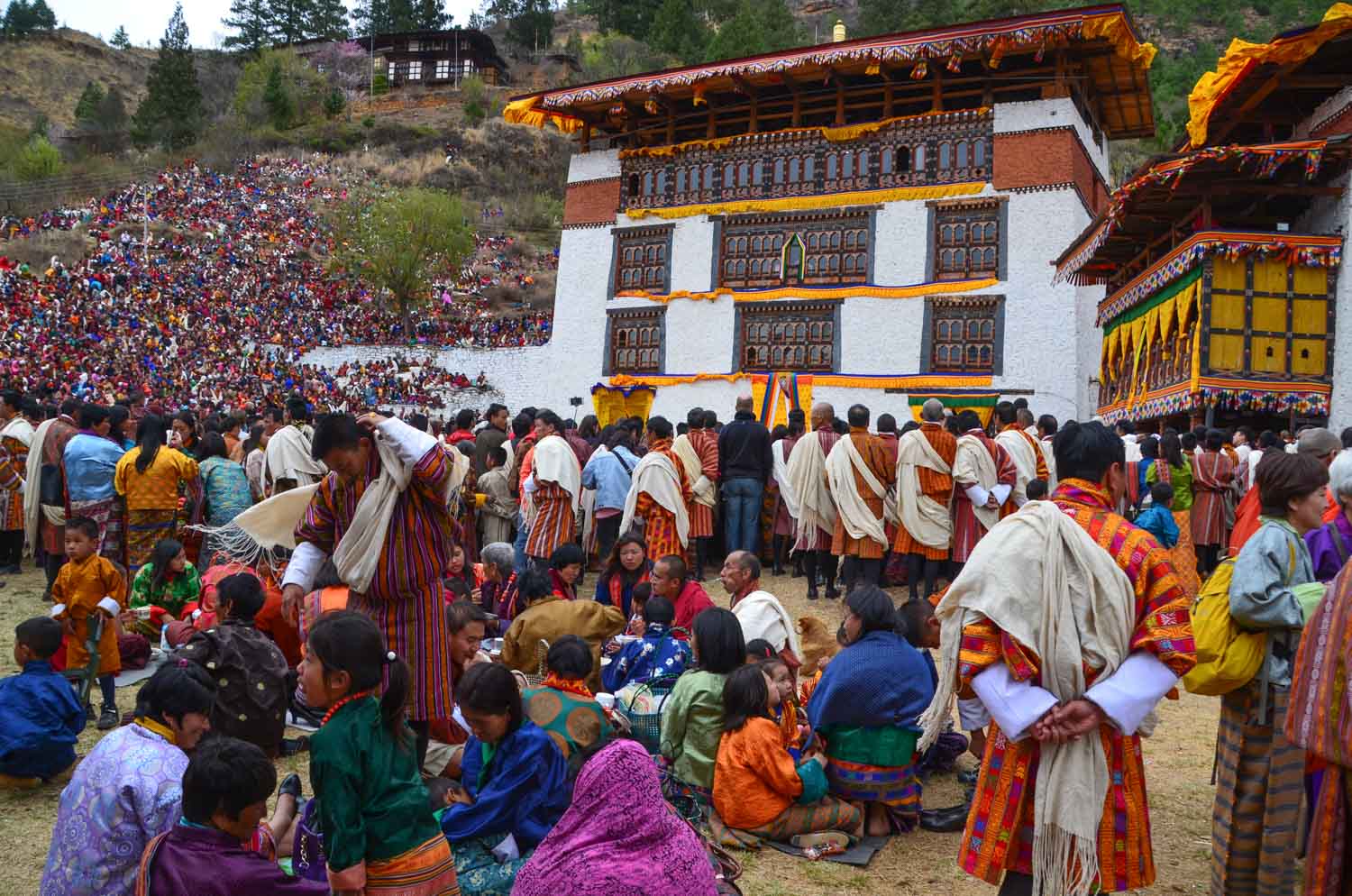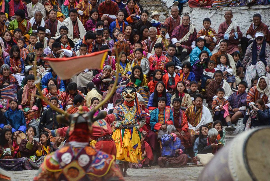 The Buthanese believe they will create merit by attending the tsechus and watching the ritualized dances. They share their food, exchange news and are surrounded by Buddhist teachings. The highlight is the unfurling of the thondrol, a giant thangka, before sunrise the last day. It is believed that your sins are washed away upon viewing this.