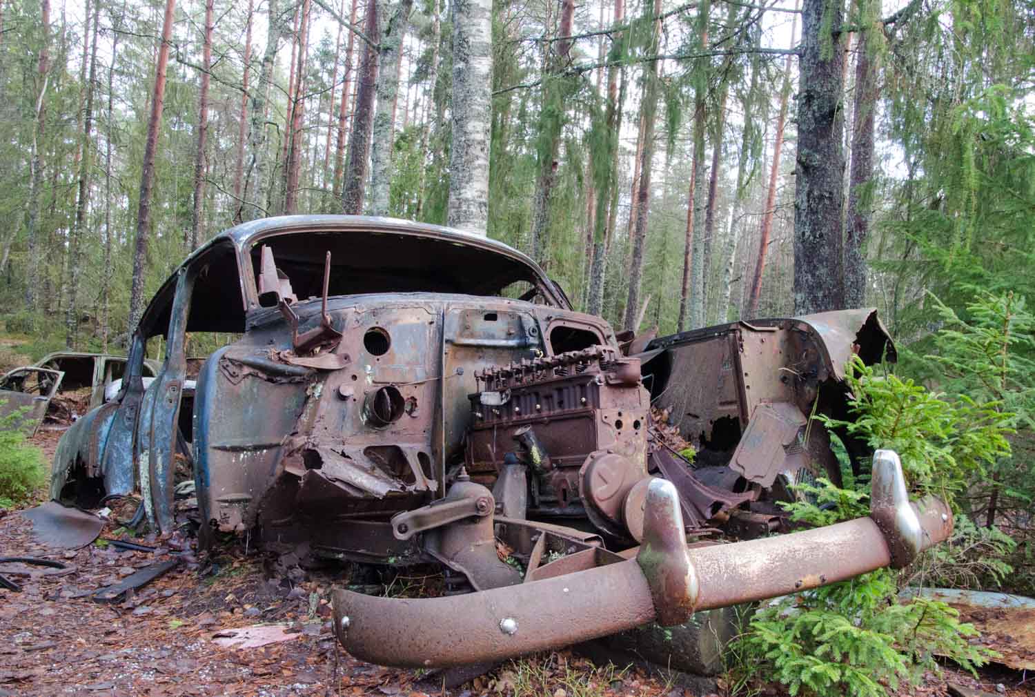 Sad, but not without beauty, is Kyrkö Mosse – a famous car graveyard some 200 kilometers from my home. Standing silently there in the forest, even I can feel them talking to me. Someone, somewhere, once found the car of his dreams, and now that car has found its final resting place here, in the middle of nature. (All toxic parts have been taken away from the cars.)
