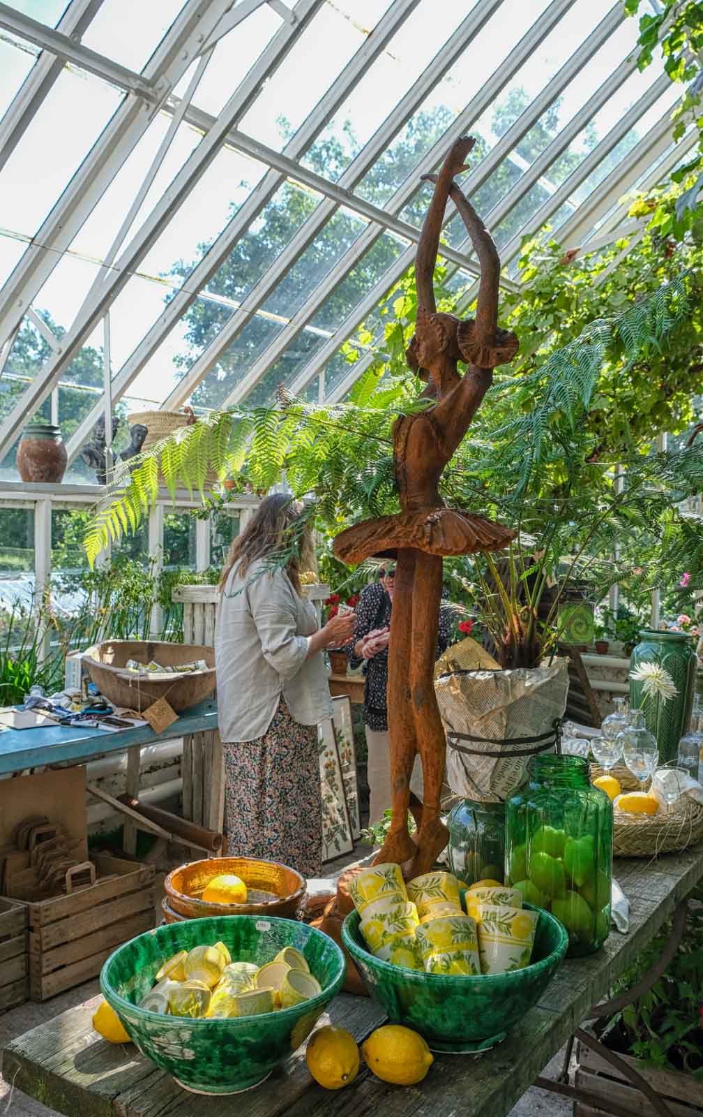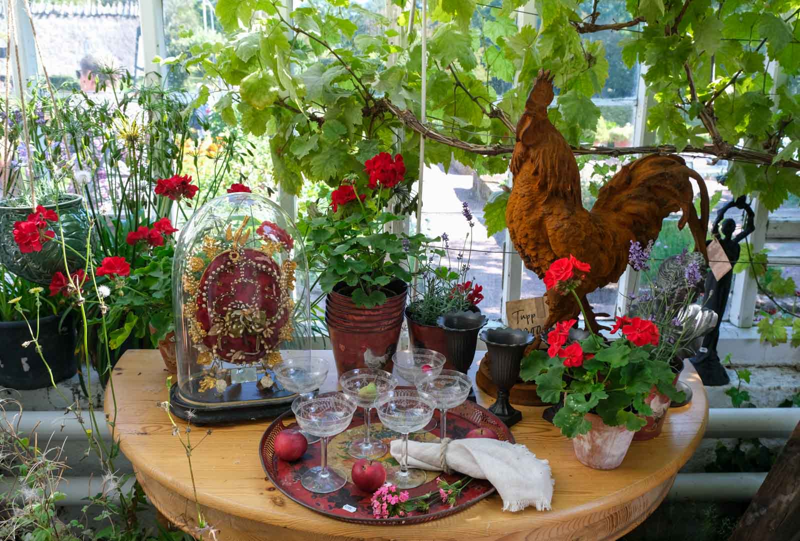 Karl Fredrik is a florist, gardener and interior designer who often is seen in different programs on Swedish TV. At Sofiero, he used a glasshouse to display his art, wine bottles, fruits and plants. And – as is his trade mark – there was MUCH of everything. I haven’t been to his home, Eklaholm, in Scania, so I was looking forward to seeing his arrangements here.