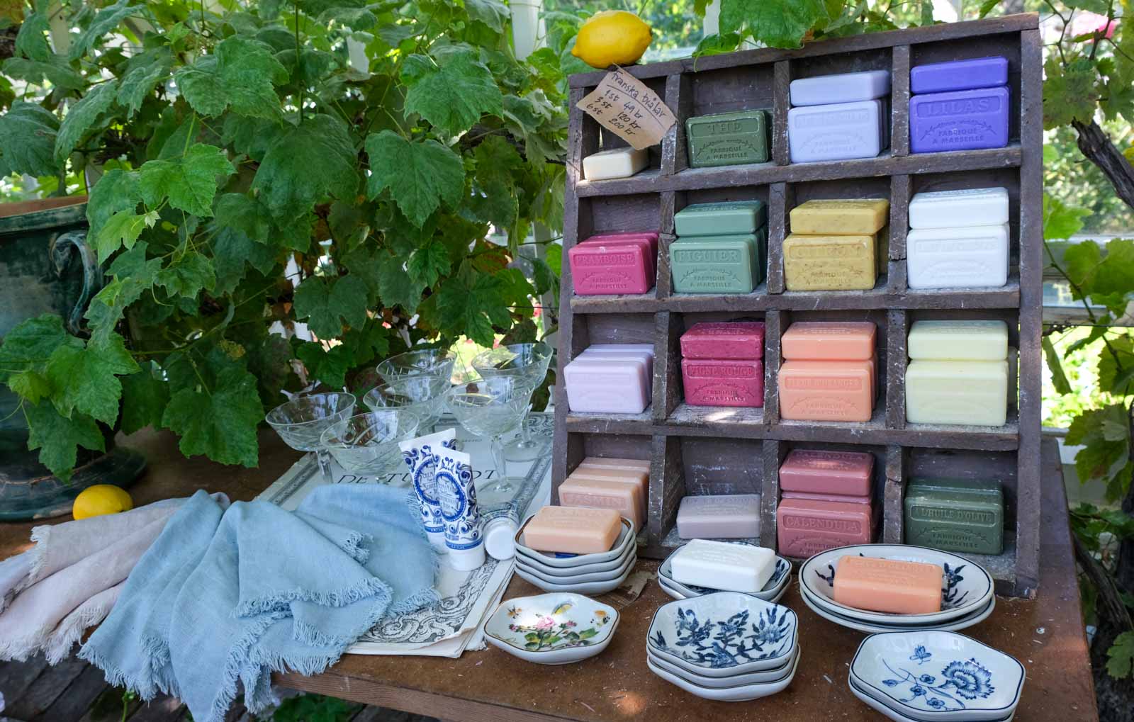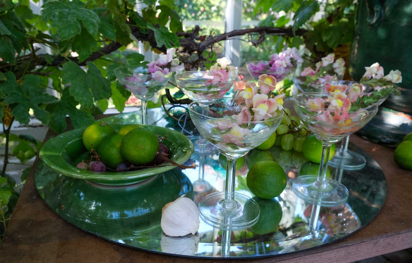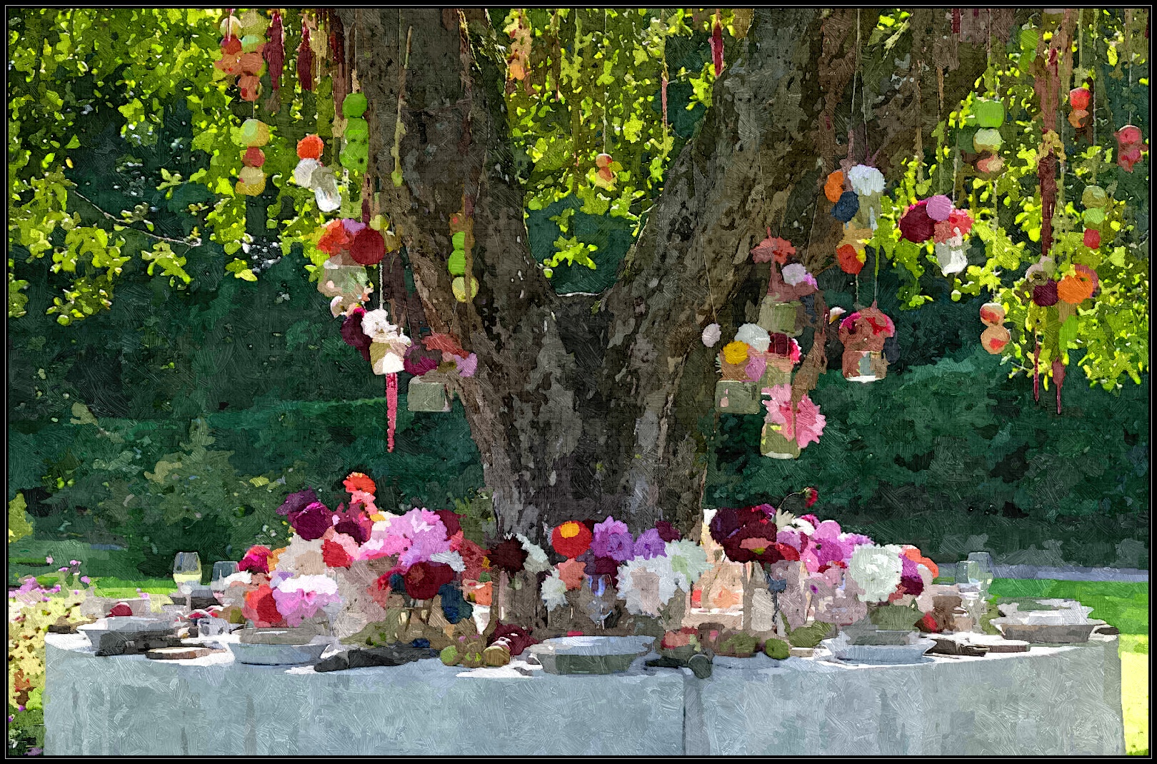 A gigantic apple tree, decorated for lunch – like a romantic painting. I wished I could have had such a lush display in my own garden. Sitting at this table with happy friends and good food – the very thought of it made my imagination swoon. I would ask all of you to be my guest!
