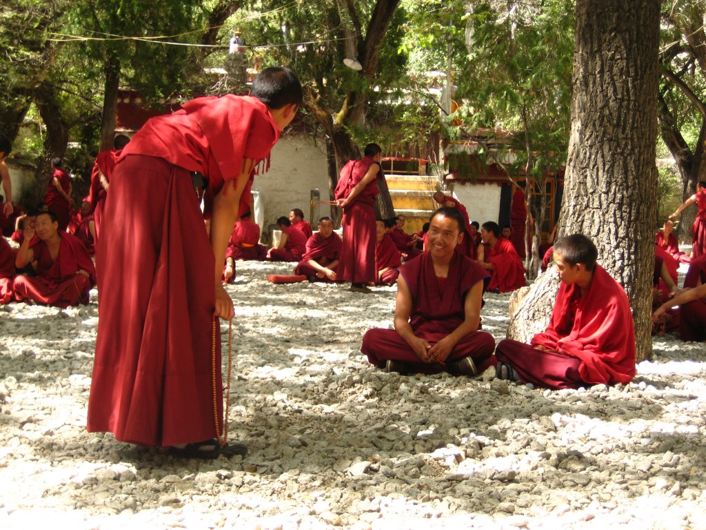 Knitting ladies in a market in Lhasa, and debating monks at the Sera Monastery. Tibetans doing their daily chores. The ladies were happy to show me their knitting technique and I showed them mine. The monks, I think, debated heavily just to show off for the tourists…