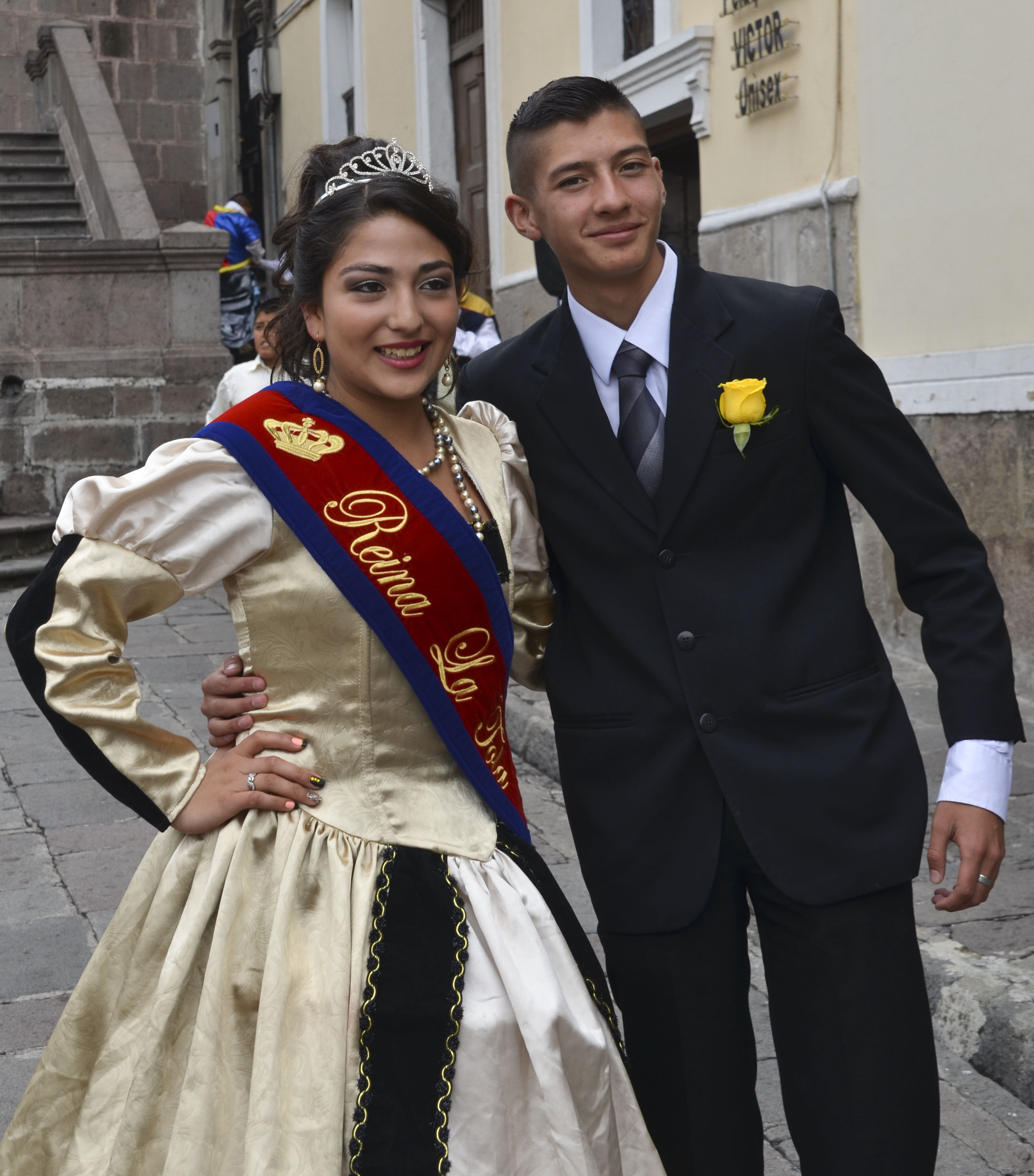 This lovely man in Thimpu, Bhutan, let me take a couple of photos of him – but when I showed him the results, he did not want to keep the close-ups… Some children where playing by the road, so I asked them what the old man was saying. They told me he thought his nose was too big! In Ecuador, the people were so lovely and smiling. Maybe because it was festival times? These beautiful ladies were singing and dancing in the street in Quito, Ecuador. We also met Miss Quito and her partner, who didn’t mind having their photo taken – we were many tourists with our cameras up in the air. My husband of course photographed the lovely lady…and as you can see, the young man gave me a nice smile.