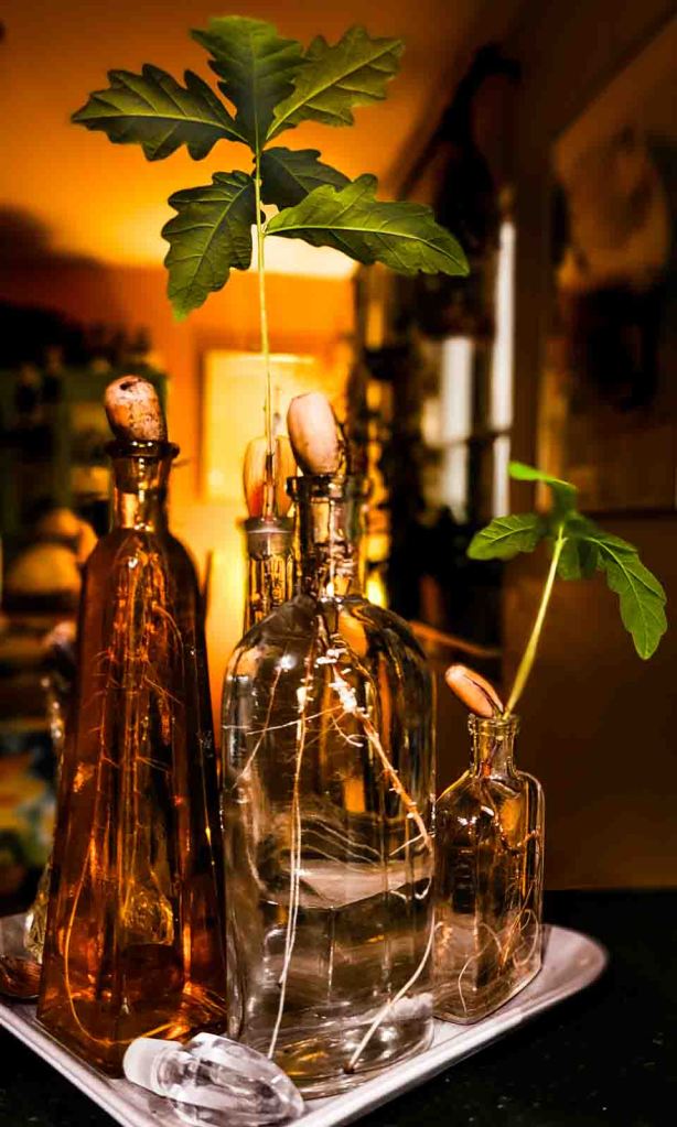 First of all, I guess we all need some magic in our lives, don’t we? Especially in difficult times like these. I try to find magical moments every day, and one of them is acorns sprouting new life, new little oak trees – in my kitchen. I enjoy looking at them growing every day.