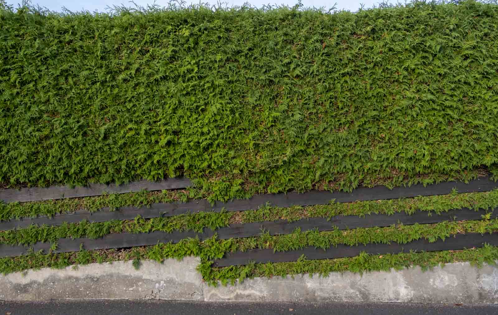 Is this ordinary laundry (not on a lamp this time ;-D…) swaying in the wind? No, it is installed there by the owners of the house, instead of a hedge or a high fence. There is a road some 20 meters behind it, and this is an efficient way of pleasing the eye from both directions… Even the colours are carefully chosen.