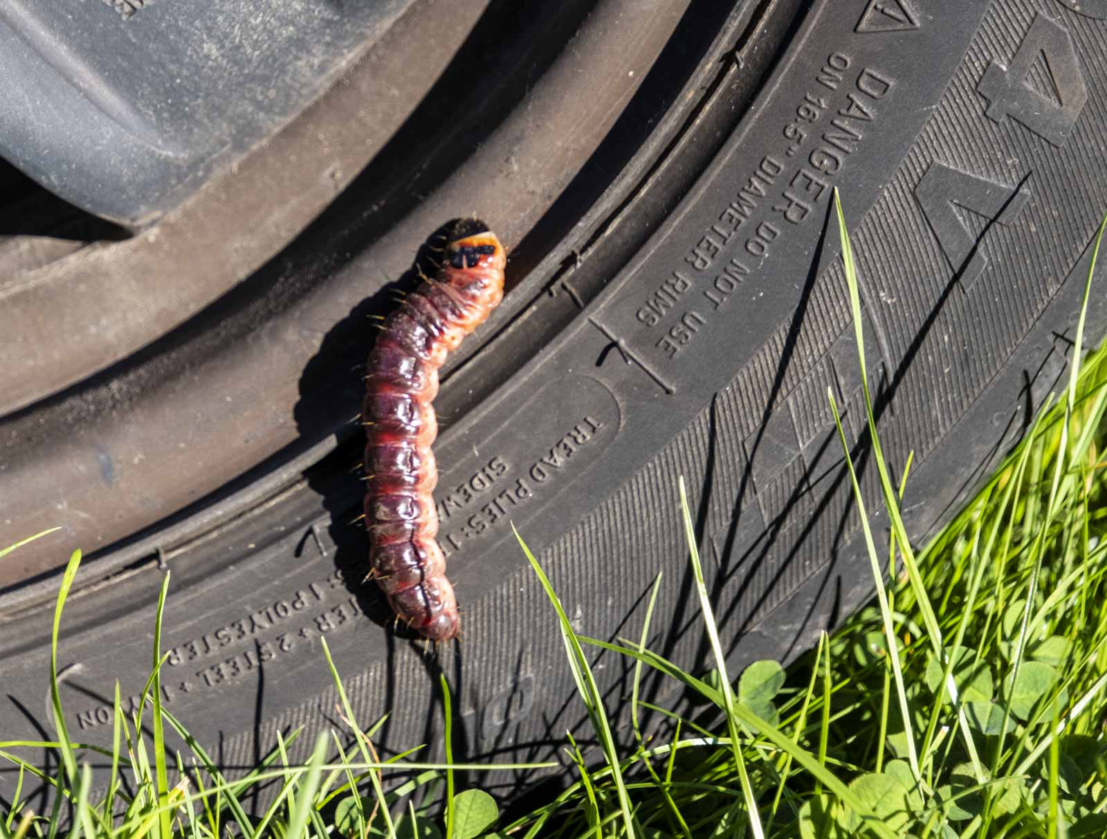 When we walk from the house and turn left, we must pass the apple trees to get to the road leading to our hike. I am always happy to find the old oak is still standing! I have to check on him a couple of times a year. When we pass one of the parked cars, I find this pretty young ”butterflytobe”, a Cossus cossus (Swedish name: större träfjäril). We walk by the lama meadows too, and I get a loving look (?) from a really handsome guy.