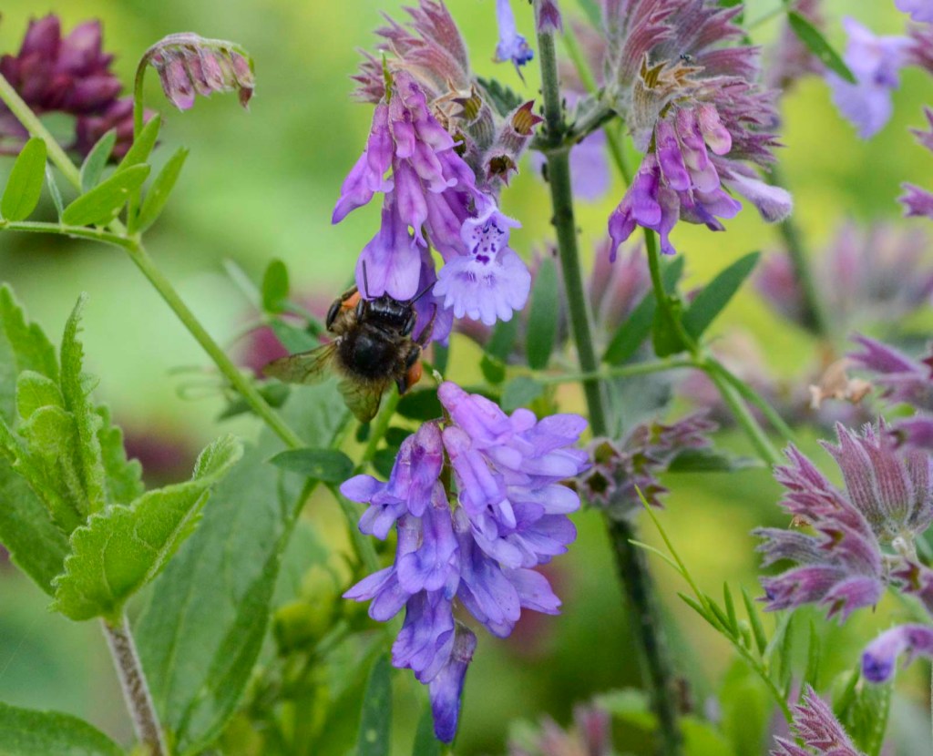 I pick up Milo and we walk along the summer houses by the water. The neighbours let their flowers invade the walk, and I love those high, handsome bells.