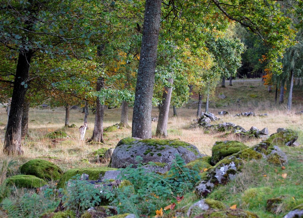 Det börjar bli varmt och jackan åker av. Jag stannar en stund och sitter vid de fina ekarna mellan gärdena. Väl inne på nästa äng hittar jag lite mer björnbär. Det har dock varit för torrt i höst för att de ska vara riktigt många, stora och saftiga.