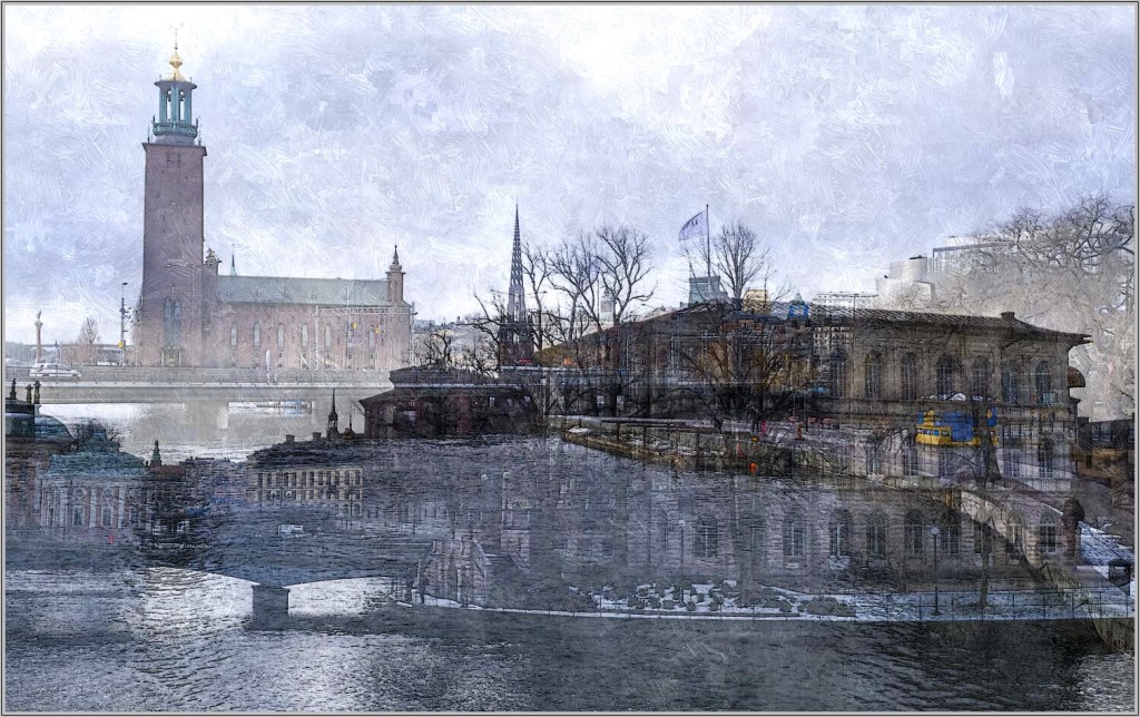 Earlier this year (pre-pandemic…), a grey day, just like today, I had some hours between trains in Stockholm. I walked past Stockholm City Hall, sailing in the air – a double exposure processed with an oil painting filter.
