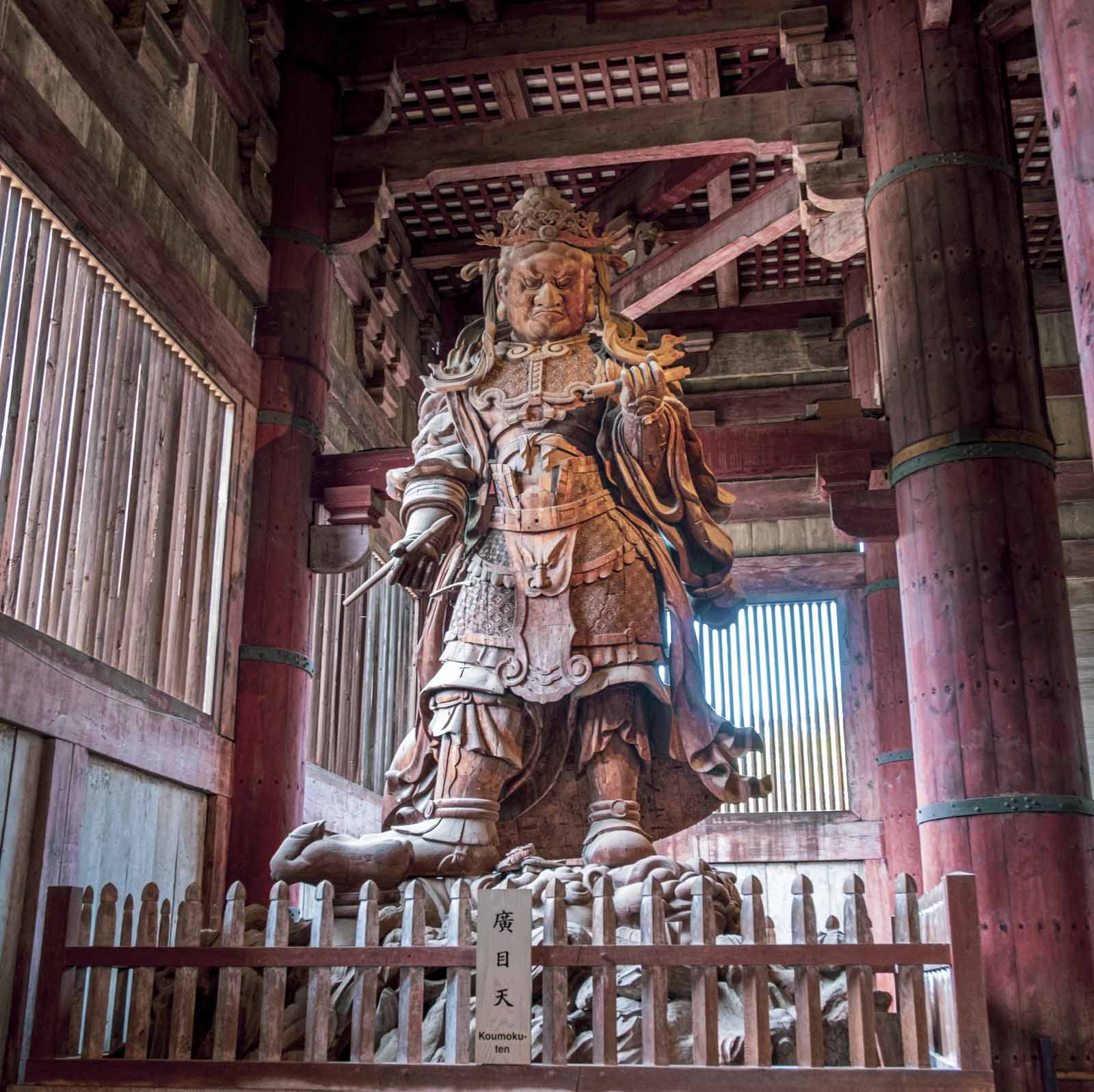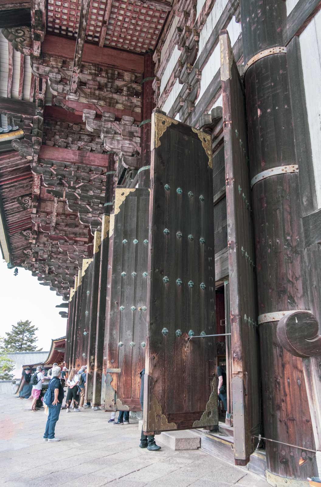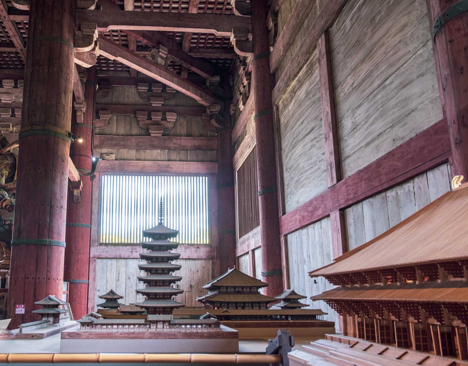 The Buddha is accompanied by two Bodisattvas and some grotesque guards. There was also a model of the whole complex as it once looked. The Great Buddha Hall to the right, and then some pagodas that is no longer there. I found the doors so very beautiful.